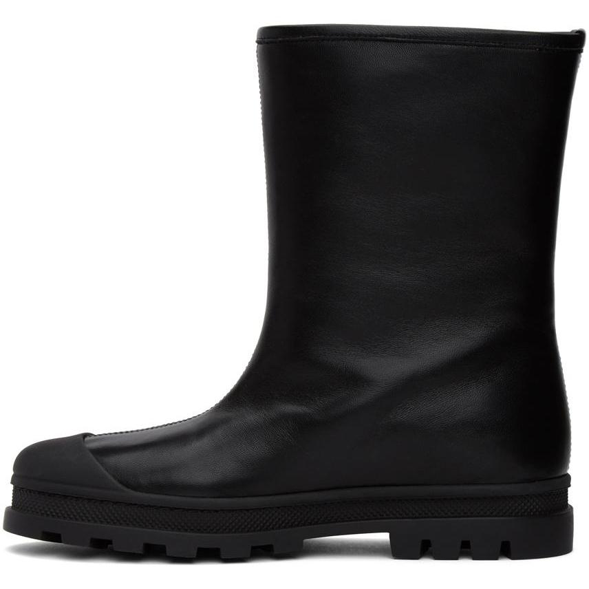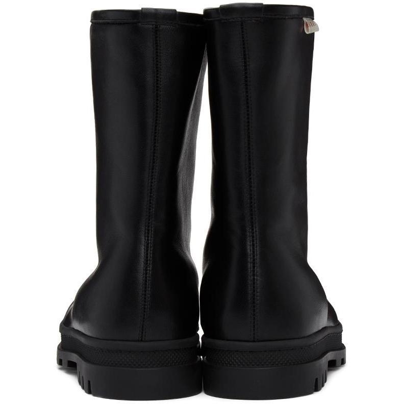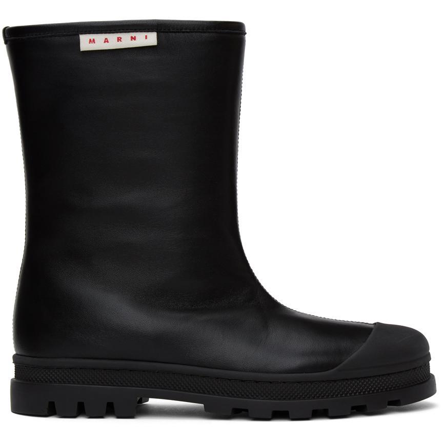 Mid-calf buffed leather boots in black. Round rubber cap toe. Logo flag in white and red at collar. Buffed leather lining. Tonal treaded rubber sole. Supplier color: Black Upper: leather. Sole: rubber. Brand: Marni