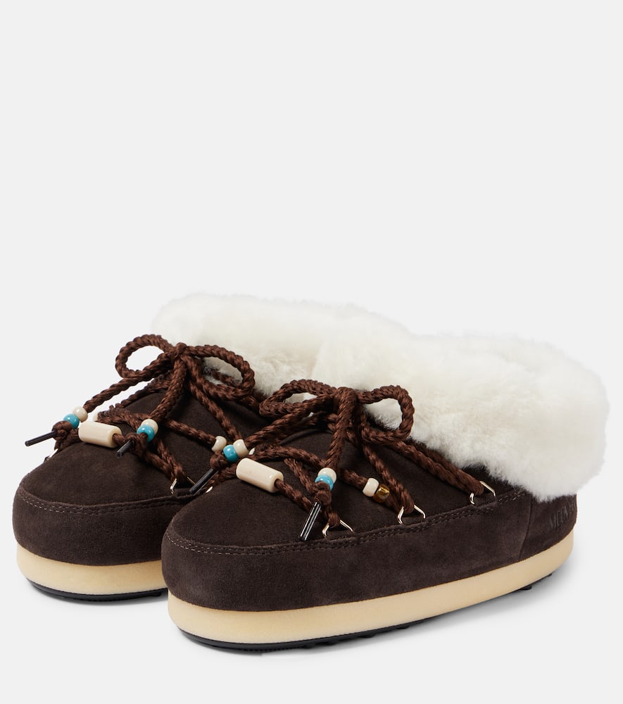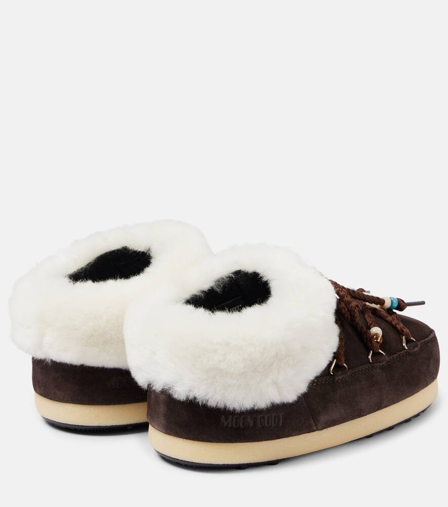 Upper: leather. Lining: fabric. Sole: shearling insole, rubber sole. Toe shape: round toe. Made in China. Includes: shoe box. Designer color name: Dark Brown/Natural. Trim: shearling. Closure: lace-up. Shop the latest Moon Boot Ankle Boots for women now.