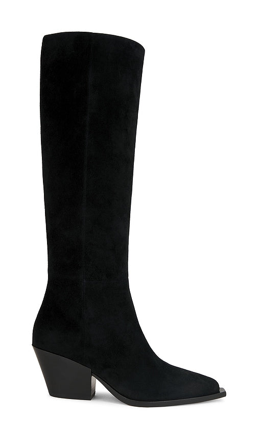 Suede upper with leather sole. Pull-on styling. Leather footbed and lining. Pointed square toe with wooden block heel. Approx 65mm/ 2.5 inch heel Approx 381mm/ 15 inch shaft Shaft measures approx 14.13 in circumference. PAIG-WZ87. SH890302-BLK. Born and raised in Los Angeles, Paige combines Southern California casual with pure sophistication. As a top fit model for denims heavy hitters Paige acquired cunning knowledge of fashion and an acute attention to detail. Paige launched her name-sake line to offer cutting edge design and trend setting styles. Color: Black. Shop Black Knee-High Boots for women and the latest PAIGE shoes now.