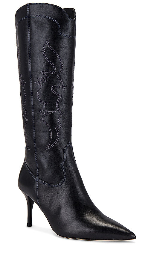 RAYE Bellamy Boot in Black. - size 10 (also in 6, 6.5, 7, 7.5, 8, 8.5, 9, 9.5) RAYE Bellamy Boot in Black. - size 10 (also in 6, 6.5, 7, 7.5, 8, 8.5, 9, 9.5) Leather upper with leather sole. Made in Brazil. Partial side zipper closure. Leather footbed with faux leather lining. Western inspired stitching throughout. Pointed toe. Approx 83mm/ 3.25 inch heel Approx 311mm/ 12.25 inch shaft Shaft measures approx 12.56 in circumference. RAYE-WZ2504. RYSH1606 S24. Inspired by the word Reina, the Spanish word for queen, Raye is the queen bee shoe brand that will surely capture your heart. With an extensive assortment of silhouettes from heels to boots and sandals to flats, Raye has that perfect something for everyone. Shop the latest in fashion from RAYE