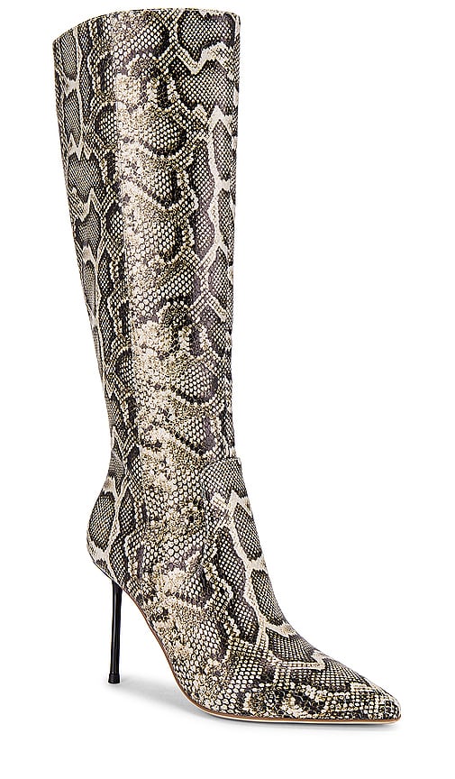 RAYE Dale Boot in Neutral. - size 5.5 (also in 6, 6.5, 7, 8, 9.5) RAYE Dale Boot in Neutral. - size 5.5 (also in 6, 6.5, 7, 8, 9.5) Snake embossed leather upper with rubber sole. Made in China. Side zipper closure. Leather footbed and lining. Pointed toe with stiletto heel. Approx 90mm/ 3.5 inch heel Approx 368mm/ 14.5 inch shaft Shaft measures approx 13.34 in circumference. RAYE-WZ2488. RYSH1538 S24. Inspired by the word Reina, the Spanish word for queen, Raye is the queen bee shoe brand that will surely capture your heart. With an extensive assortment of silhouettes from heels to boots and sandals to flats, Raye has that perfect something for everyone. Shop the latest in fashion from RAYE