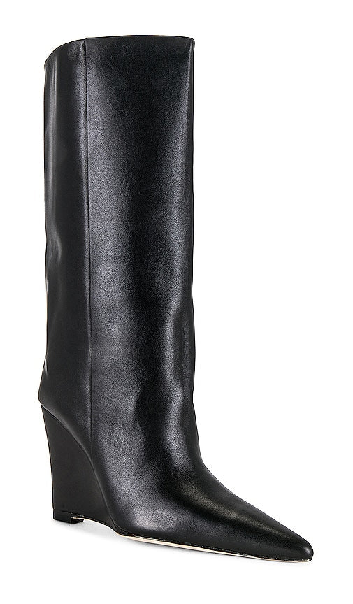 RAYE Denisse Boot in Black. - size 10 (also in 7, 7.5, 8, 8.5) RAYE Denisse Boot in Black. - size 10 (also in 7, 7.5, 8, 8.5) Leather upper and lining with leather sole. Made in China. Pull-on styling. Pointed toe. Wedge heel. Approx 90mm/ 3.5 inch wedge Approx 292mm/ 11.5 inch shaft Shaft measures approx 14 in circumference. RAYE-WZ2437. RYSH1541 F23. Inspired by the word Reina, the Spanish word for queen, Raye is the queen bee shoe brand that will surely capture your heart. With an extensive assortment of silhouettes from heels to boots and sandals to flats, Raye has that perfect something for everyone. Shop the latest in fashion from RAYE