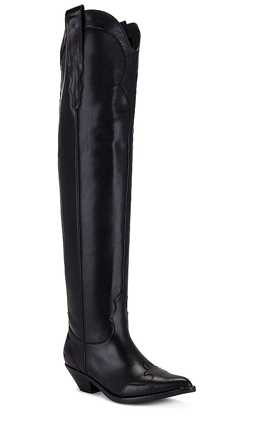 RAYE Prescott Boot in Black. - size 5.5 (also in 6, 7, 7.5, 8, 8.5) RAYE Prescott Boot in Black. - size 5.5 (also in 6, 7, 7.5, 8, 8.5) Leather upper with rubber sole. Made in China. Partial side zipper closure. Leather footbed with textile lining. Dual side pull-tabs. Western inspired styling. Pointed toe with wooden block heel. Approx 57mm/ 2.25 inch heel Approx 533mm/ 21 inch shaft Shaft measures approx 15.7 in circumference. RAYE-WZ2500. RYSH1537 S24. Inspired by the word Reina, the Spanish word for queen, Raye is the queen bee shoe brand that will surely capture your heart. With an extensive assortment of silhouettes from heels to boots and sandals to flats, Raye has that perfect something for everyone. Shop the latest in fashion from RAYE
