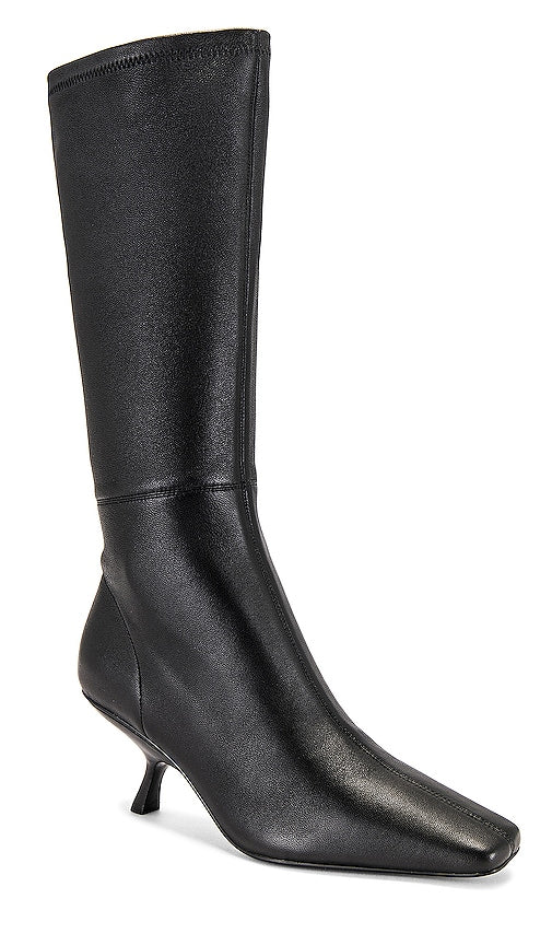 RAYE Ruxanndra Boot in Black. - size 5.5 (also in 9.5) RAYE Ruxanndra Boot in Black. - size 5.5 (also in 9.5) Leather upper with manmade sole. Made in China. Partial side zipper closure. Square toe with angled kitten heel. Approx 50mm/ 2 inch heel Approx 355mm/ 14 inch shaft Shaft measures approx 21.9 in circumference. RAYE-WZ2446. RYSH1513 R23. Inspired by the word Reina, the Spanish word for queen, Raye is the queen bee shoe brand that will surely capture your heart. With an extensive assortment of silhouettes from heels to boots and sandals to flats, Raye has that perfect something for everyone. Shop the latest in fashion from RAYE