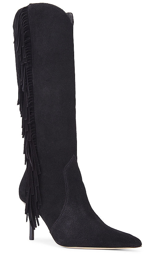 RAYE Syd Boot in Black. - size 10 (also in 5.5, 6, 6.5, 7, 7.5, 8, 8.5, 9, 9.5) RAYE Syd Boot in Black. - size 10 (also in 5.5, 6, 6.5, 7, 7.5, 8, 8.5, 9, 9.5) Suede upper with smooth leather sole. Made in Brazil. Side zipper closure. Fringe detail at side. Pointed toe. Approx 75mm/ 3 inch heel Approx 406 mm/ 16 inch shaft. RAYE-WZ2560. RYSH1624 S24. Inspired by the word Reina, the Spanish word for queen, Raye is the queen bee shoe brand that will surely capture your heart. With an extensive assortment of silhouettes from heels to boots and sandals to flats, Raye has that perfect something for everyone. Shop the latest in fashion from RAYE