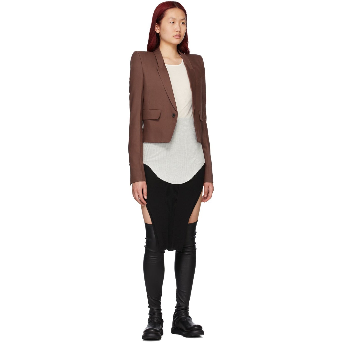 Thigh-high stretch buffed leather boots in black. Round toe. Tonal jersey lining. Tonal stacked leather midsole. Tonal treaded rubber outsole. Supplier color: Black Upper: leather. Sole: rubber. Brand: Rick Owens