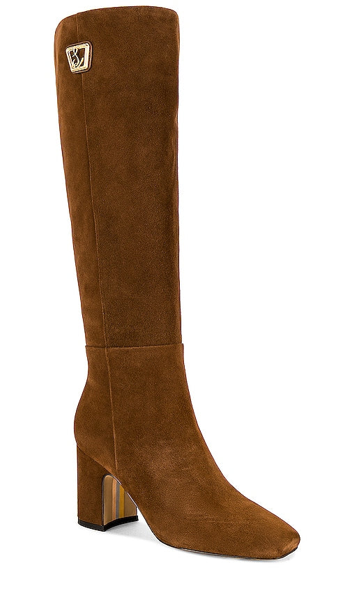 Sam Edelman Faren Boot in Brown. - size 10 (also in 6, 6.5, 7, 7.5, 8, 8.5, 9, 9.5) Sam Edelman Faren Boot in Brown. - size 10 (also in 6, 6.5, 7, 7.5, 8, 8.5, 9, 9.5) Suede upper with manmade sole. Imported. Side zipper closure. Gold-tone logo hardware at side. Square toe with block heel. Approx 95mm/ 3 inch heel Approx 387mm/ 15.25 inch shaft Shaft measures approx 12.5 in circumference. SAME-WZ1009. I7287L1200. Sam Edelman is a lifestyle brand devoted to a trend-on, irreverent and whimsical style. Inspired by timeless American elegance, the brand offers a unique selection of iconic and contemporary fashion that bridges the gap between aspiration and attainability to define modern luxury. Shop the latest in fashion from Sam Edelman