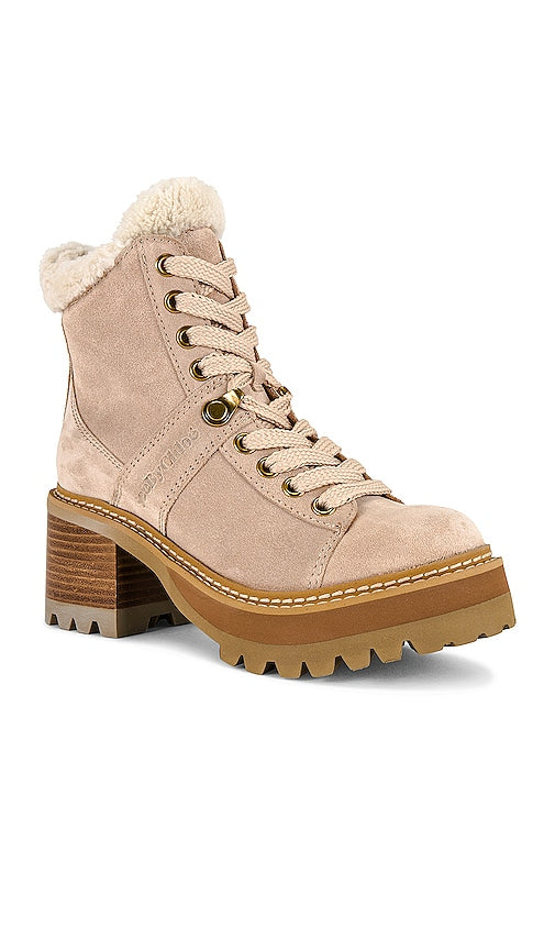 See By Chloe Maeliss Boot in Beige. - size 38 (also in 39) See By Chloe Maeliss Boot in Beige. - size 38 (also in 39) Suede upper with dyed sheepskin trim and rubber sole. Made in Spain Fur Origin: South Africa. Lace-up front. Leather footbed and lining. Tonal embossed See By Chloé logo at side panel. Rounded toe with wooden block heel and lug sole. Approx 70mm/ 2.75 inch heel Approx 125mm/ 5 inch shaft Approx 32mm/ 1.25 inch platform. SEEB-WZ366. SB41083A-18030. Launched in 2001, See by Chloe is a more relaxed and casual response to the success of the pieces to its elegant sister brand Chloe. See by Chloe has grown into a complete ready-to-wear line that has found favor by adding an urban edge to feminine tailoring. Shop the latest in fashion from See By Chloe