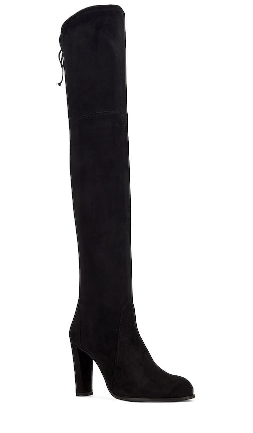 Stuart Weitzman Highland Boot in Black. - size 10 (also in 6.5, 7, 7.5, 8, 9.5) Stuart Weitzman Highland Boot in Black. - size 10 (also in 6.5, 7, 7.5, 8, 9.5) Suede upper with rubber sole. Made in Spain. Pull-on styling. Top tie detail. Approx 100mm/ 4 inch heel Approx 609mm/ 24 inch shaft. STUA-WZ101. S0050. Stuart Weitzman crafts precisely engineered shoes designed for high fashion and high function. Known for its artisanal Spanish craftsmanship and quality, the luxury brand is committed to melding fashion, function and fit in each silhouette. Every pair is constructed to maximize style and comfort so that women around the world can shine confidently in their Stuart Weitzman shoes. Shop the latest in fashion from Stuart Weitzman