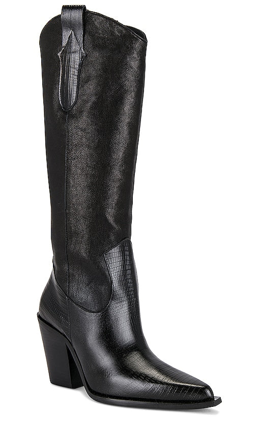 TORAL Delilah Boot in Black. - size 37 (also in 38, 40) TORAL Delilah Boot in Black. - size 37 (also in 38, 40) Leather blend upper with manmade sole. Made in Spain. Pull-on styling. Leather blend footbed and lining. Side pull-tabs. Pointed toe with wooden block heel. Approx 90mm/ 3.5 inch heel Approx 356mm/ 14 inch shaft Shaft measures approx 12.56 in circumference. TRAL-WZ150. TL-DELILAH. Shop the latest in fashion from TORAL