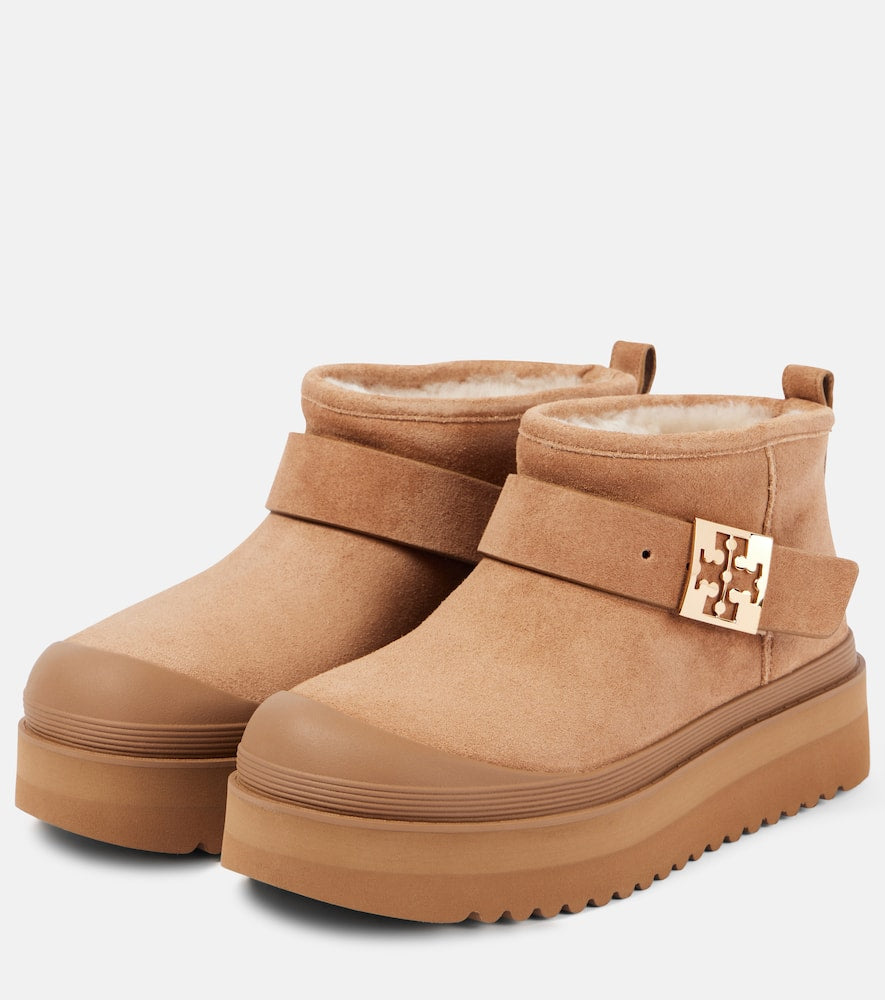 Upper: suede. Lining: shearling. Sole: shearling insole, rubber sole. Toe shape: round toe. Made in Italy. Includes: shoe box, dust bag. Designer color name: Light Chestnut/ Gold. Shop the latest Tory Burch Ankle Boots for women now.