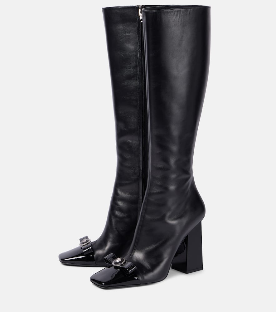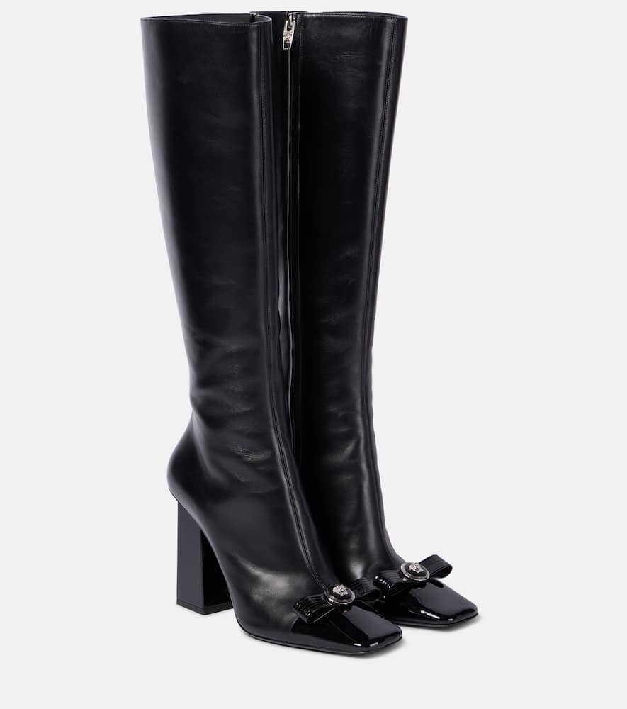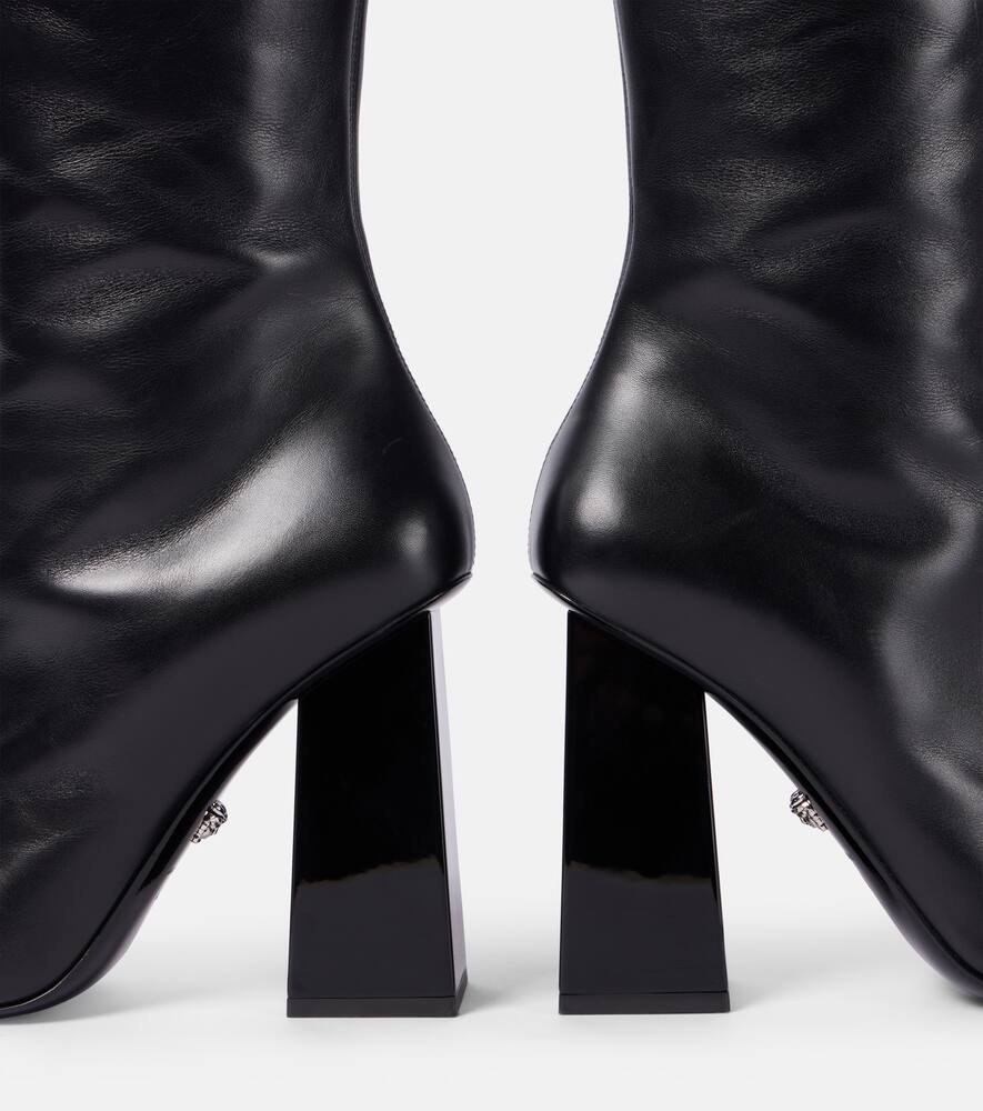 Upper: calf leather. Lining: leather. Sole: leather insole and sole. Toe shape: square toe. Made in Italy. Includes: shoe box. Designer color name: Black-Palladium. Closure: zipped side. Shop the latest Versace High-Heel Boots for women now.