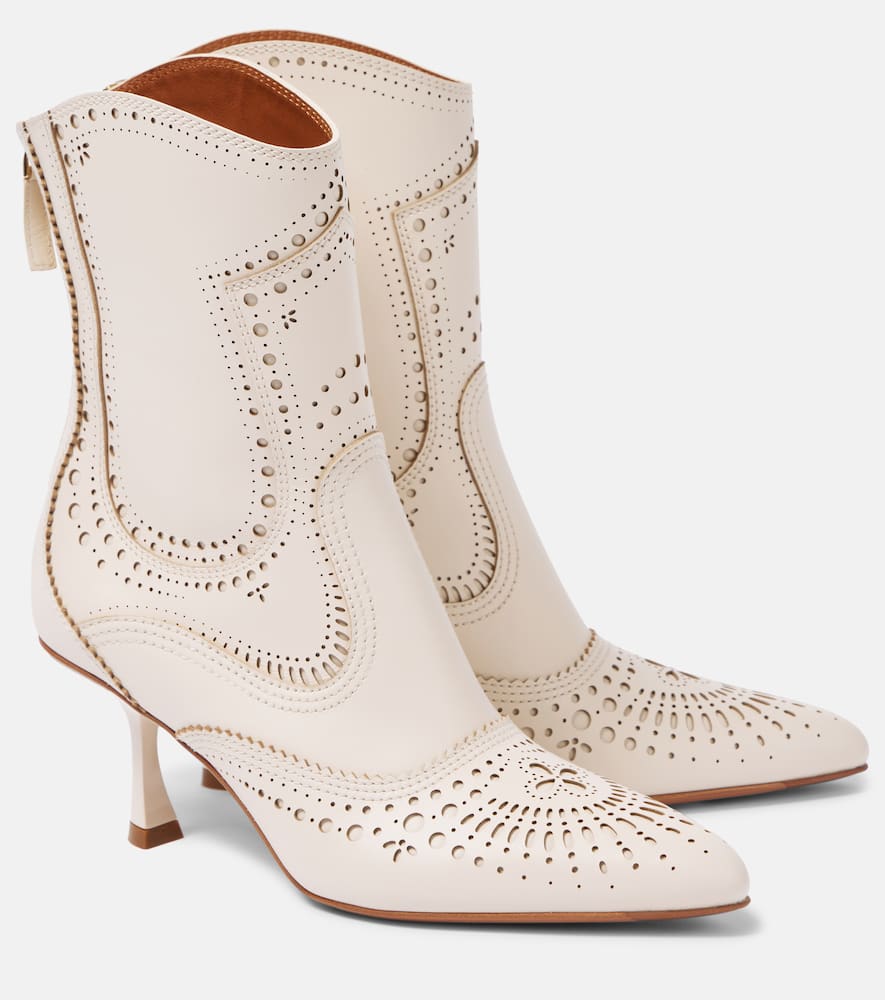 Upper: leather. Lining: leather. Sole: leather insole and sole. Toe shape: pointed toe. Made in Italy. Includes: shoe box, dust bag. Designer color name: Vanilla. Closure: zipped back. Shop the latest Zimmermann Mid-Heel Boots for women now.