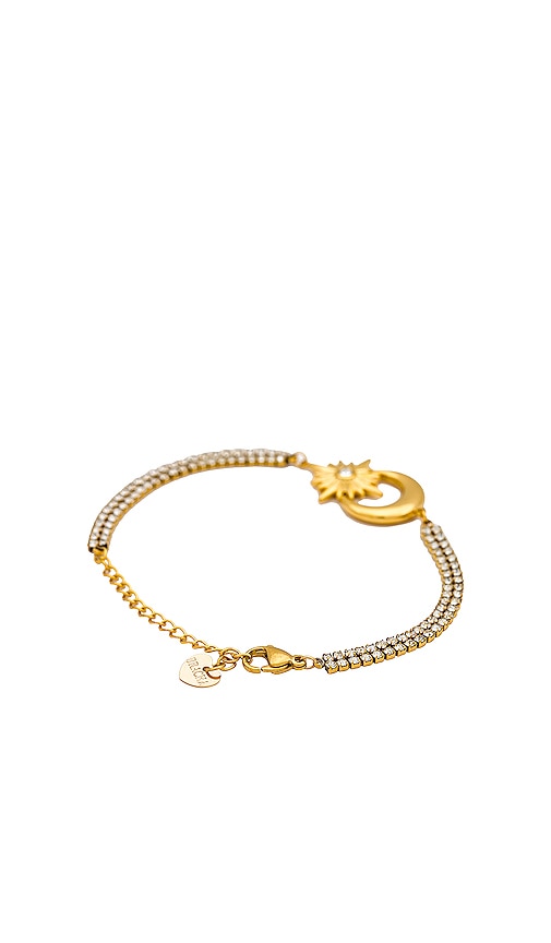 BRACHA Celeste Bracelet in Metallic Gold. BRACHA Celeste Bracelet in Metallic Gold. Gold-plated stainless steel with cubic zirconia stones and crescent moon and starburst charm. Made in USA. Lobster clasp closure. Measures approx 6.5 in length with a 2 extender. BCHA-WL208. B-58M. Starting in 2012, the sister duo Sayra and Michelle combined their different styles to create the coveted jewelry brand BRACHA. They have been published in major magazines and seen on top influencers, and their top-quality designs that don't break the bank have made them a major sought-after brand. Their commitment is to make jewelry accessible to everyone and to create styles that can be worn no matter what the current trend is. They combine top quality stones and gold-filled mixed metals to bring designs that appeal to women of all generations. Life and seasons always change, BRACHA keeps up. Shop the latest in fashion from BRACHA
