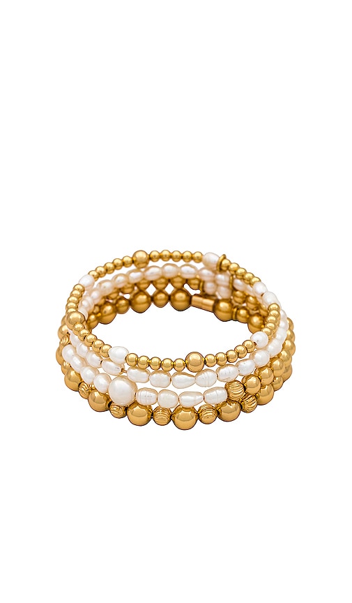 Ettika Beaded Bracelet Set in Metallic Gold. Ettika Beaded Bracelet Set in Metallic Gold. Gold-tone beads and pearls. Made in China. Open structure design. Set of 4. Measures approx 2.25 in diameter. ETTI-WL1295. C232.PRL.G. Ettika was dreamt to life with a few meaningful words in mind: Give. Wear. Stack. Love. Ettika fashioners, Ettie Rafaeli and Joey Rafaeli feed their design drive with daily inspirations and delights soaked up while living the sunny Los Angeles California lifestyle. From the sandy beaches of Malibu, to the neon bright sparkling city lights of Tinseltown, the designers naturally incorporate a kiss of the LA laid-back-luxe lifestyle into each inspired piece. Shop the latest in fashion from Ettika