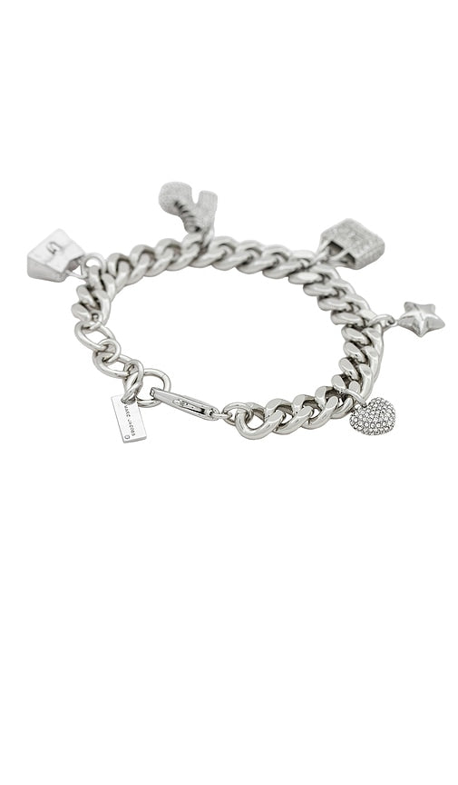 Marc Jacobs Mini Icon Pave Charm Bracelet in Metallic Silver. Marc Jacobs Mini Icon Pave Charm Bracelet in Metallic Silver. Silver-plated brass with novelty charms. Made in China. Lobster clasp closure. Measures approx 8 in length. MARJ-WL181. 2R3JBR001J81. For the last 30 years, the Marc Jacobs brand has unapologetically pushed and shaped the boundaries of American fashion. This innovation is driven by Marc Jacobs himself, who continues to be an outspoken force to be reckoned with. In his dream world, we are all the stars of our own movie - and his namesake label provides the tools to define individuality and personality. Shop the latest in fashion from Marc Jacobs