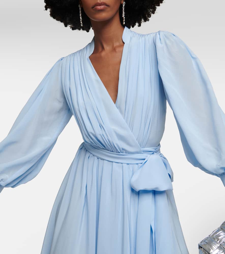 Material: 100% silk. Care instructions: dry clean. Made in Poland. Designer color name: Light Blue. Lining: 100% polyester. Closure: self-ties. Buttoned cuffs. Shop the latest Costarellos Midi Dresses for women.