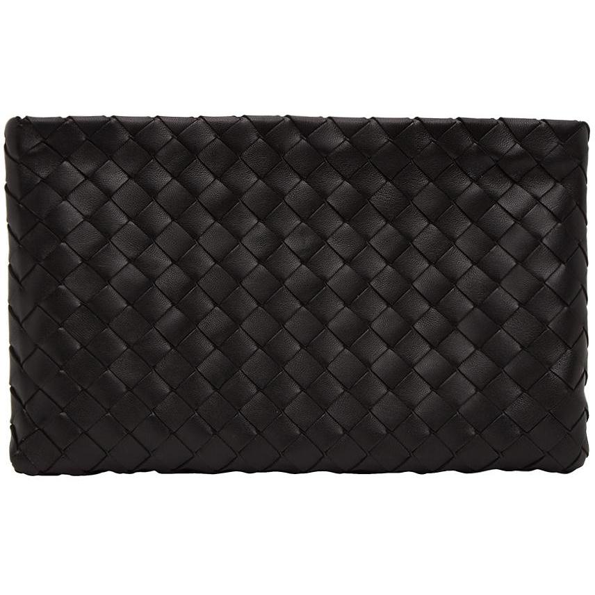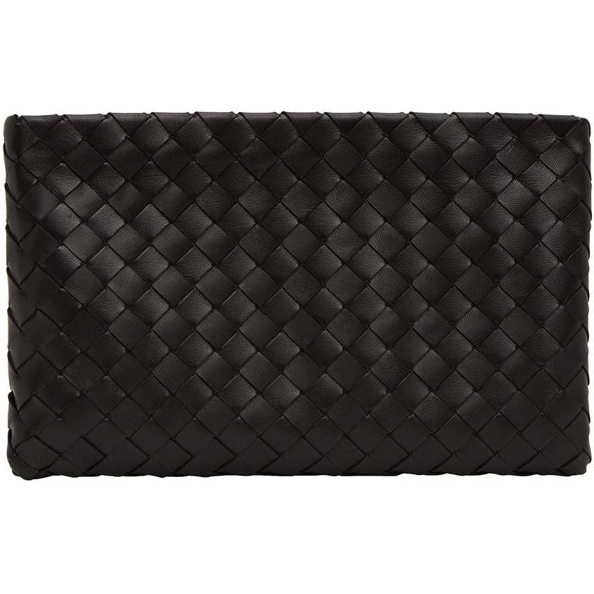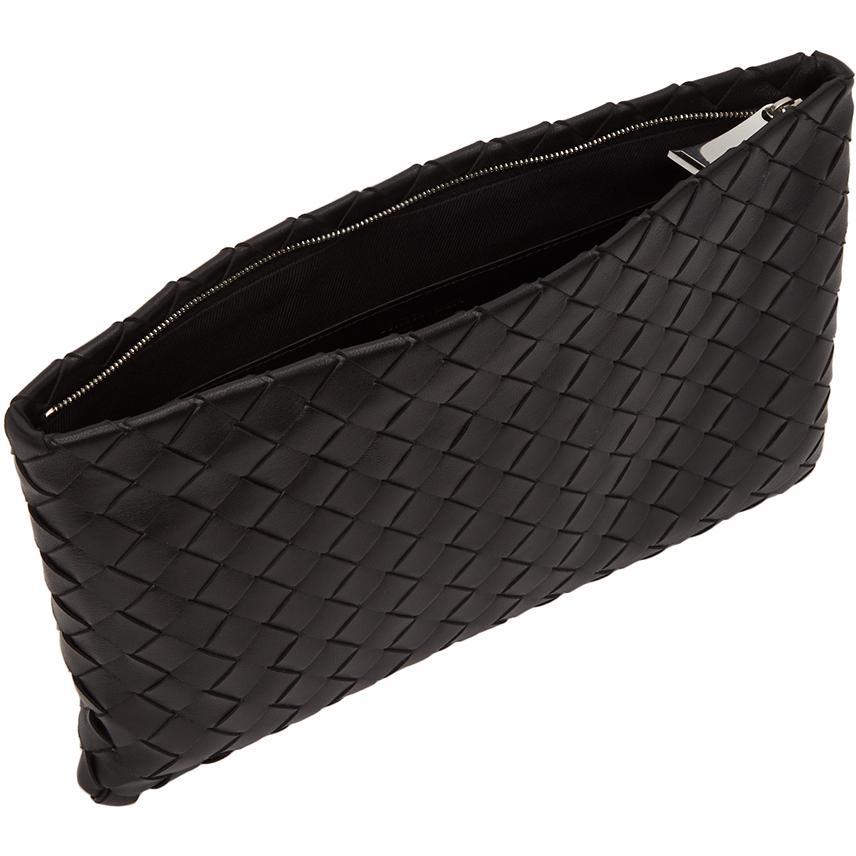 Intrecciato-woven grained lambskin pouch in black. Zip closure. Embossed logo, patch pocket, and six note slots at interior. Tonal calfskin and twill lining. Silver-tone hardware. Approx. 12 length x 7.5 height x 1.25 width. Supplier color: Black Lambskin. Brand: Bottega Veneta