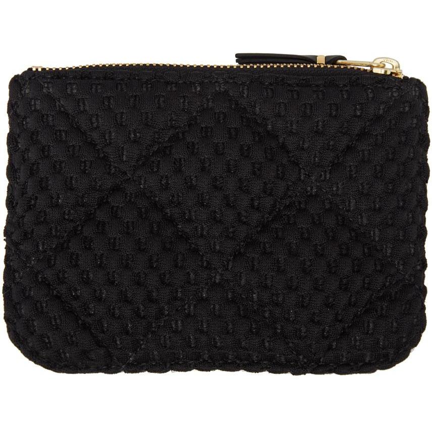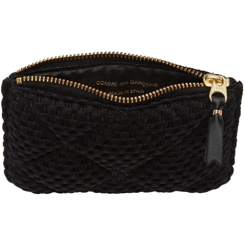 Quilted twill pouch in black. Zip closure. Tonal buffed leather lining. Gold-tone hardware. Approx. 5.5 length x 4 height. Supplier color: Black Leather, textile. Brand: Comme des Garçons Wallets