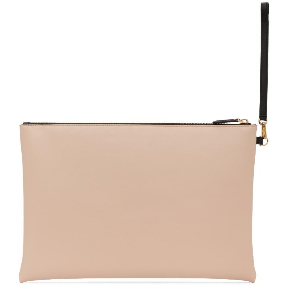 Buffed calfskin pouch in pink. Logo printed in black at face. Detachable leather wristlet strap with lanyard clasp fastening at side. Zip closure. Logo hardware at interior. Twill lining in black. Logo-engraved gold-tone hardware. Approx. 13.5 length x 9 height x 1 width Supplier color: Pink Calfskin. Brand: Fendi