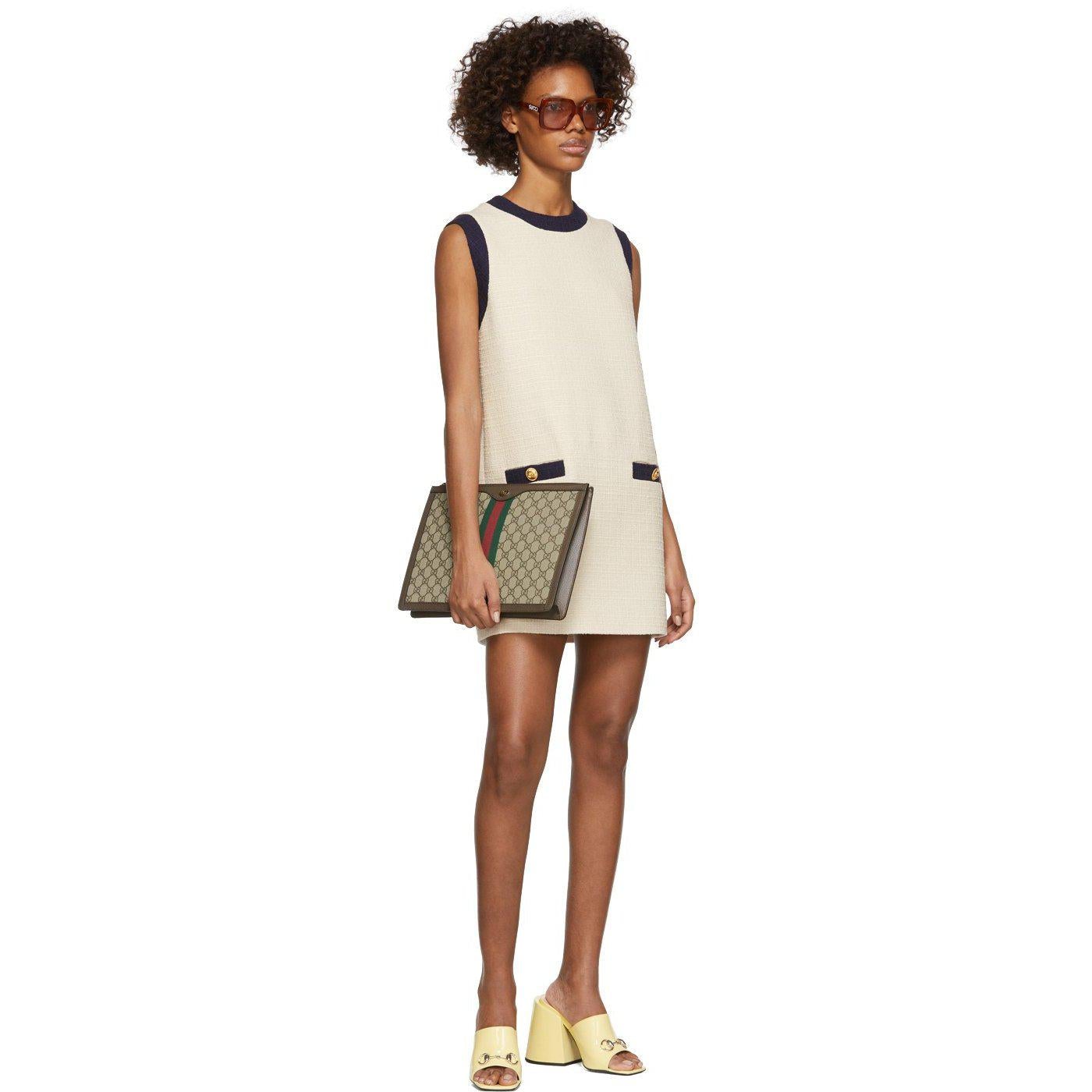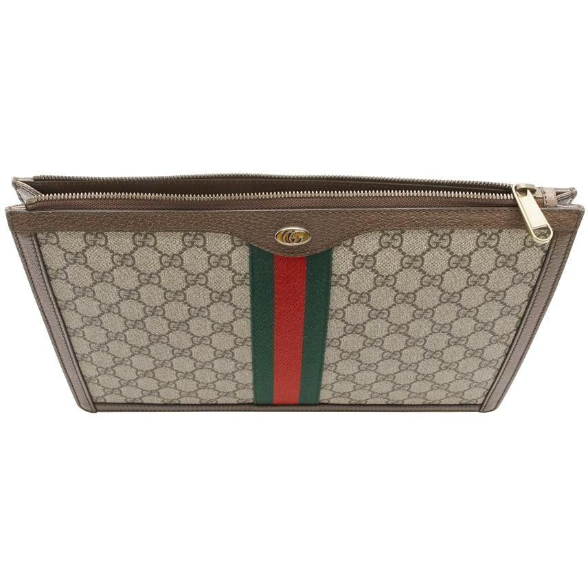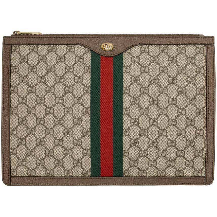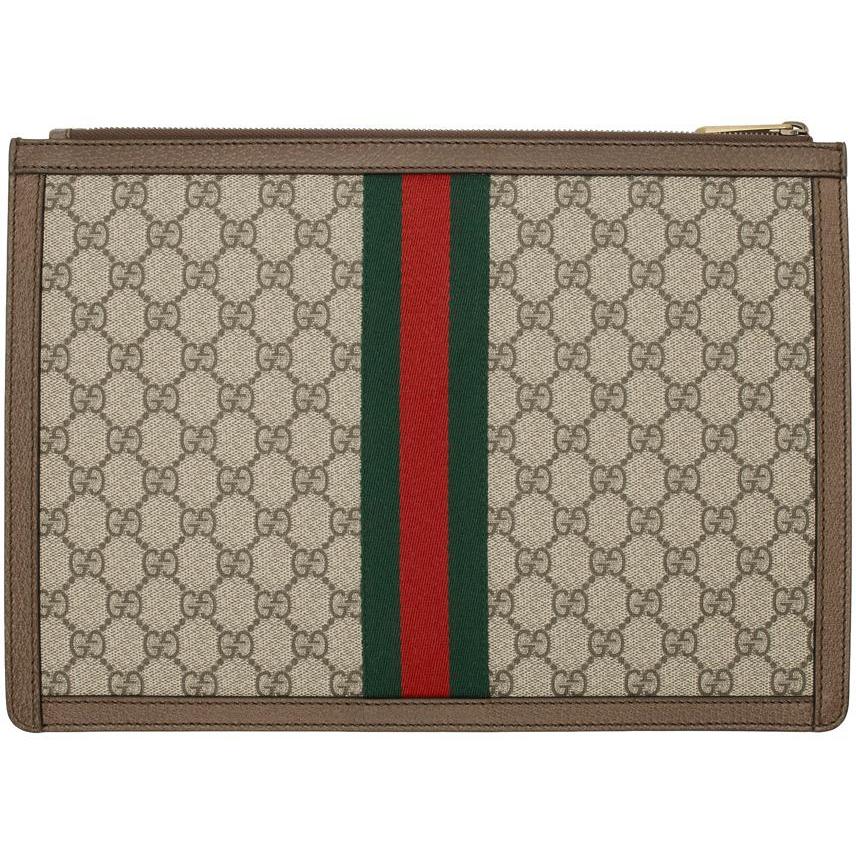 Supreme' coated canvas pouch in beige featuring logo pattern in brown. Grained leather trim in brown throughout. Logo plaque at face. Signature webbing trim in green and red at front and back faces. Zip closure. Patch pockets and zippered pocket at pink suede interior. Antiqued gold-tone and silver-tone hardware. Approx. 13.25 length x 9.5 height x 1.5 width. Supplier color: Print Textile, leather. Brand: Gucci