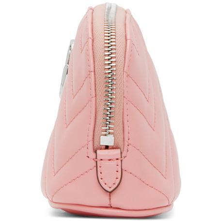 Quilted leather pouch in pink. Logo plaque at face. Zip closure. Leather logo patch at interior. Tonal textile lining. Silver-tone hardware. Approx. 7.5 length x 4 height x 2.5 width. Supplier color: Pink Leather. Brand: Gucci