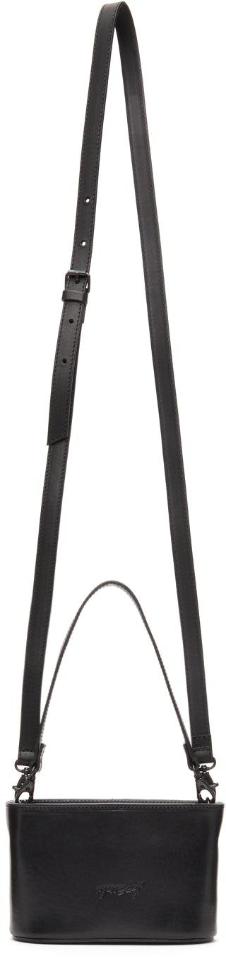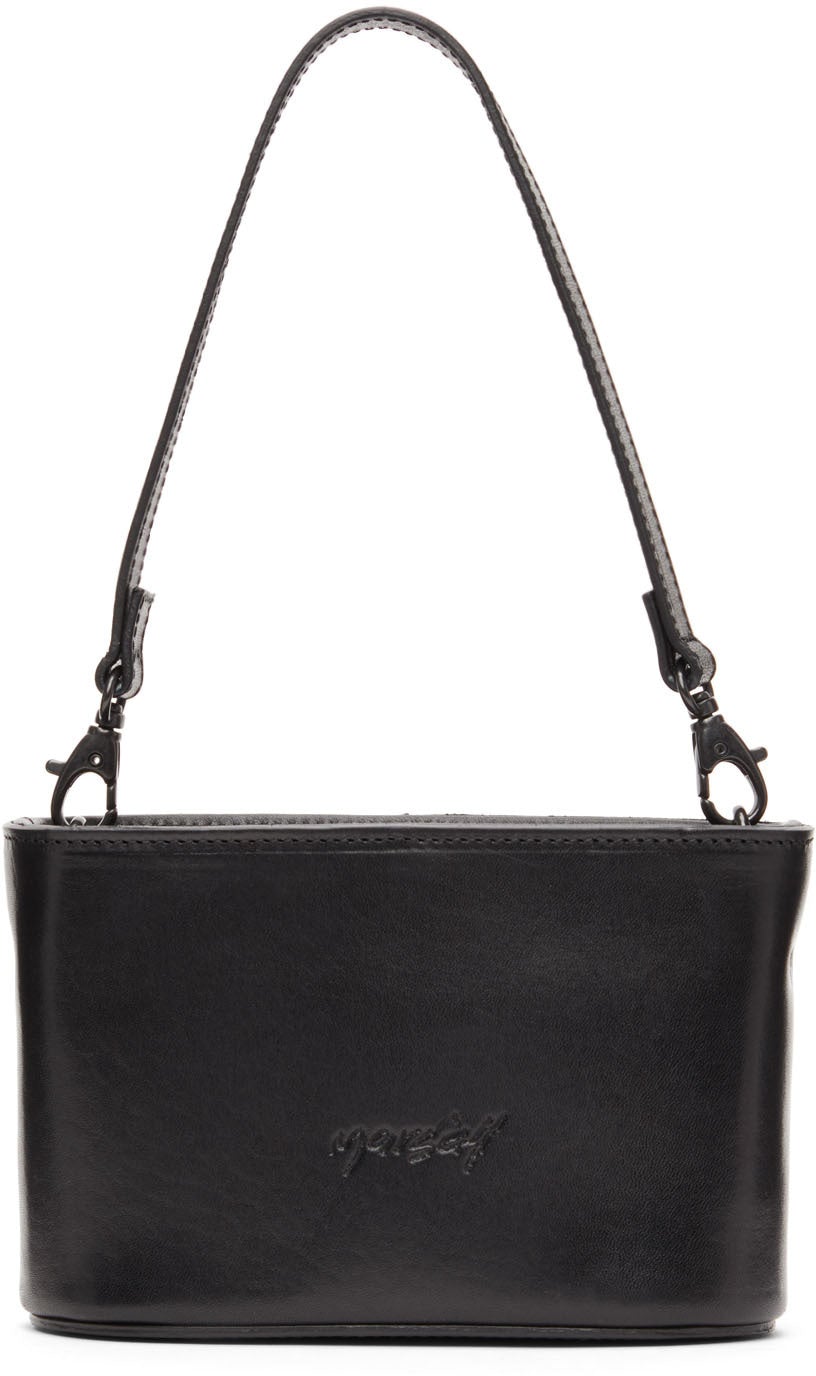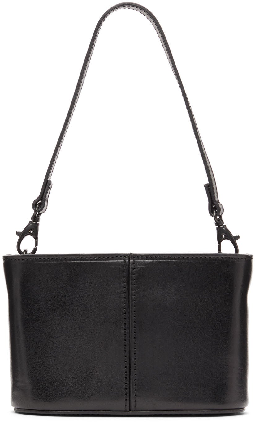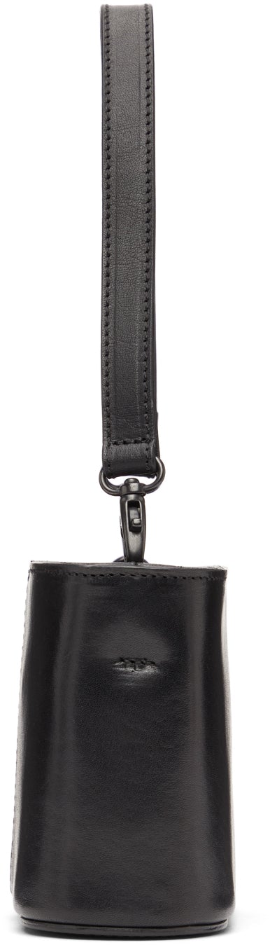 Structured buffed calfskin pouch in black. Detachable carry handle with lobster clasp fastening. Adjustable and detachable shoulder strap with pin-buckle and lobster clasp fastening. Logo embossed at face. Embossed leather logo patch at interior. Buffed calfskin lining in tan. Gunmetal-tone hardware. Approx. 6.5 length x 4 height x 2.75 width. Supplier color: Black Calfskin. Brand: Marsèll