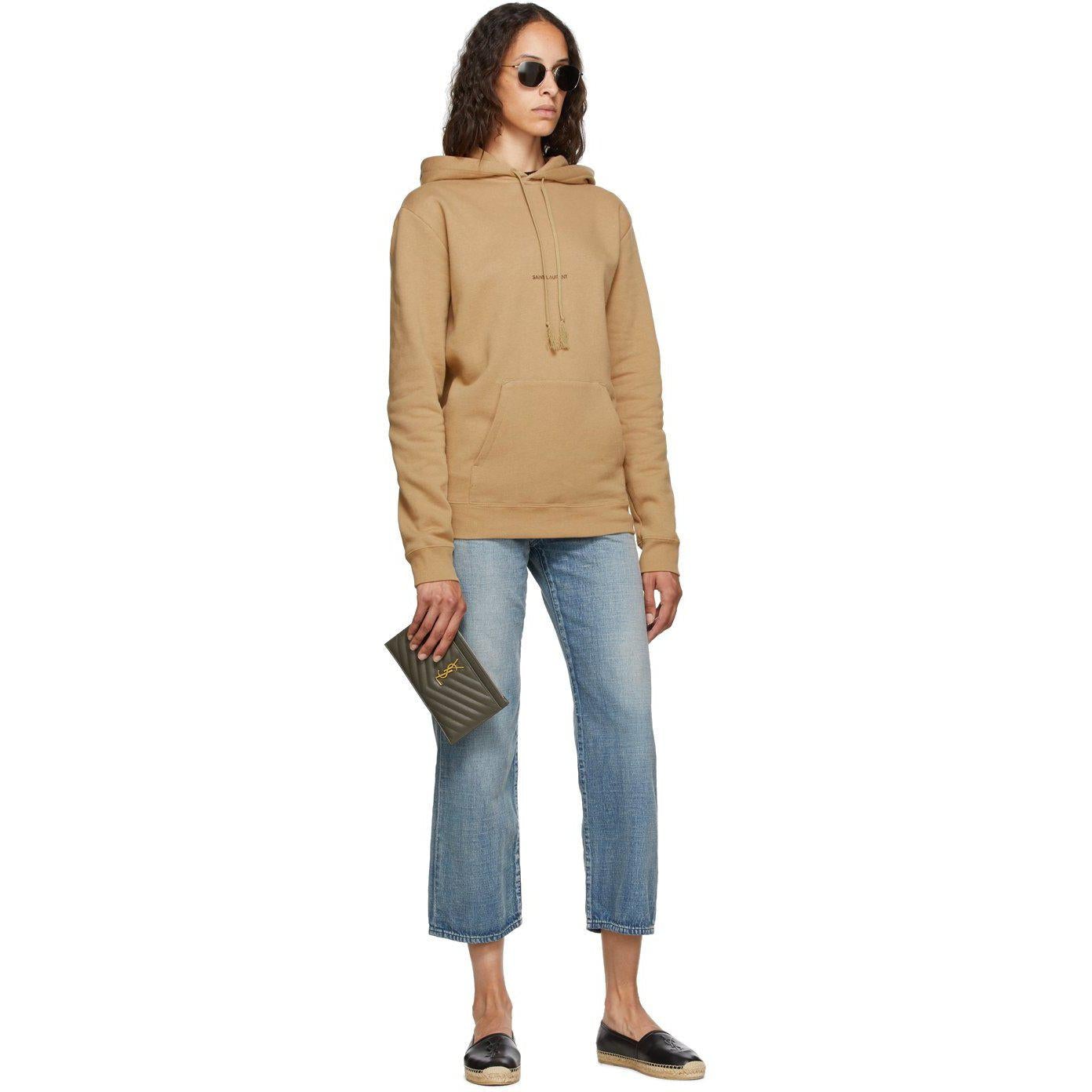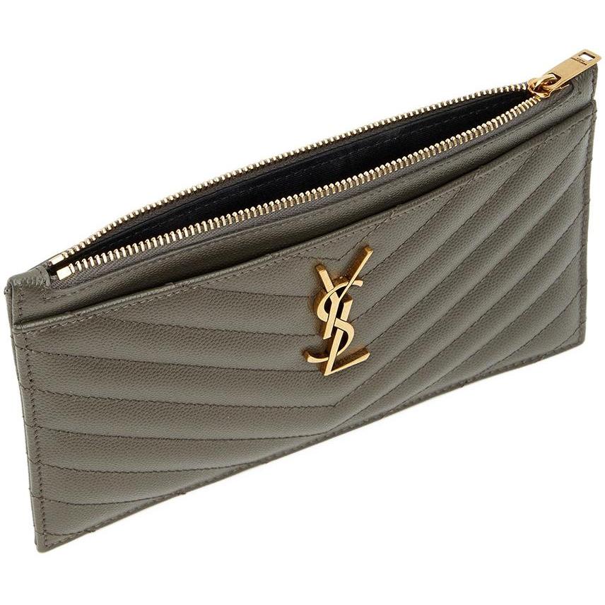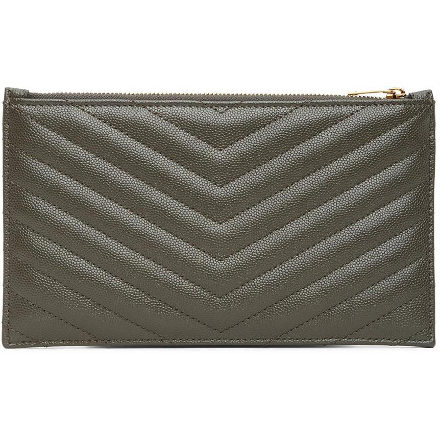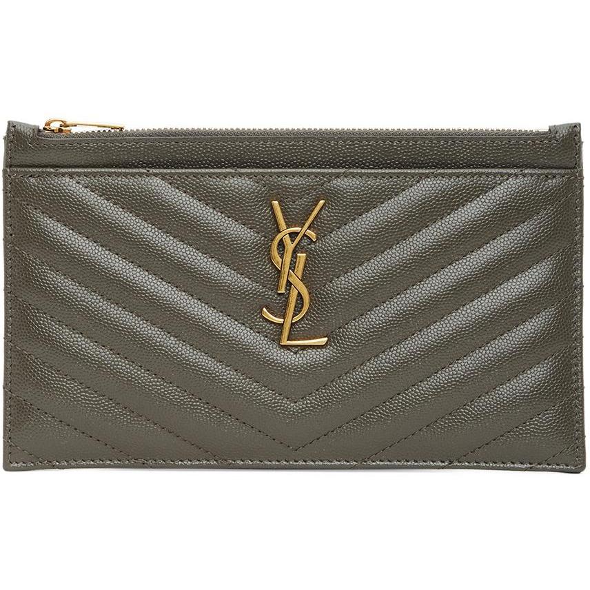 Pebble grained calfskin pouch in grey featuring chevron-style quilting throughout. Logo plaque and patch pocket at face. Zip closure. Leather logo patch and one note slot at interior. Grosgrain lining in black. Gold-tone hardware. Approx. 8 length x 5 height x 0.5 width. Supplier color: Grey Calfskin. Brand: Saint Laurent