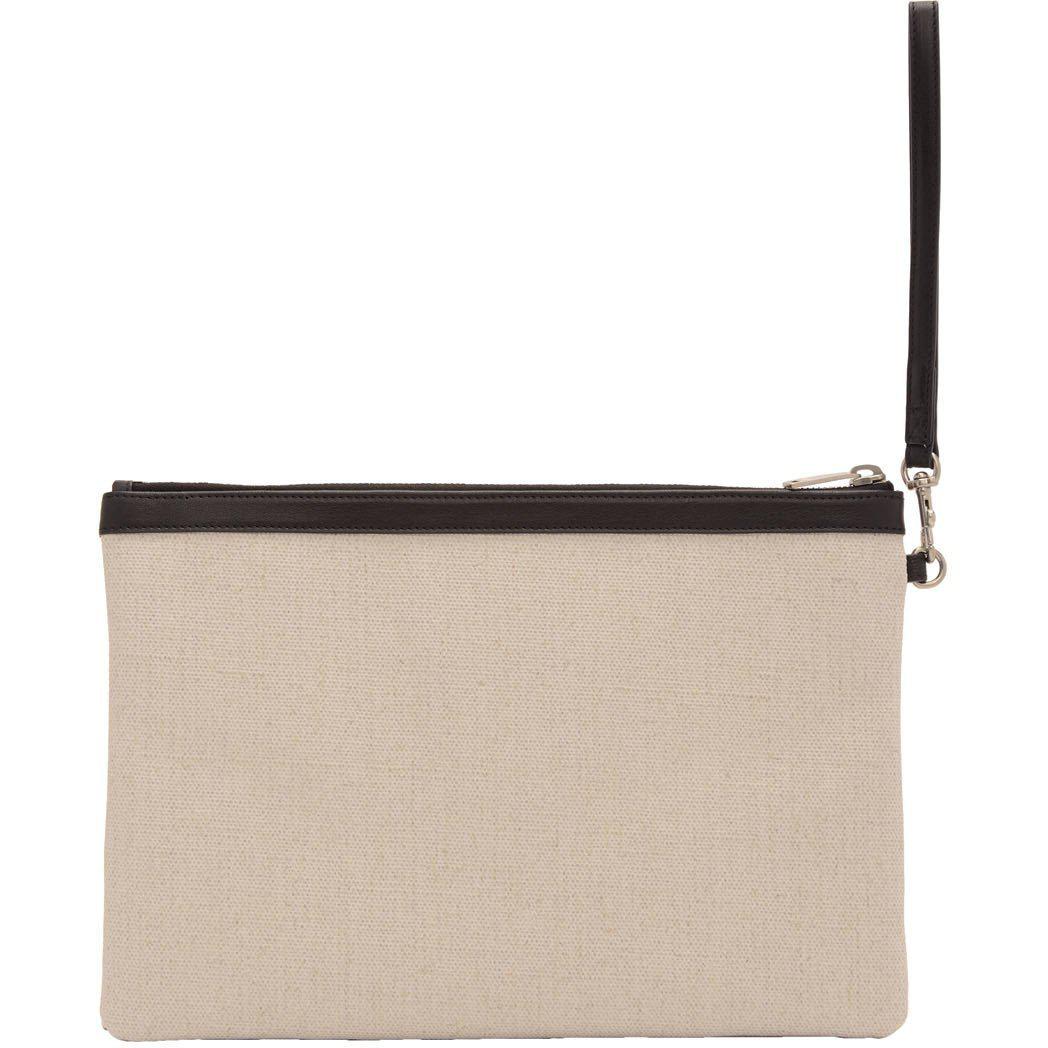 Coated linen canvas pouch in off-white. Buffed leather trim in black throughout. Logo printed in black at face. Detachable leather wristlet strap with lanyard clasp fastening at side. Zip closure at main compartment. Leather logo patch and patch pockets at interior. Textile lining in black. Silver-tone hardware. Approx. 12 length x 8.5 height. Supplier color: Natural Textile, leather. Brand: Saint Laurent