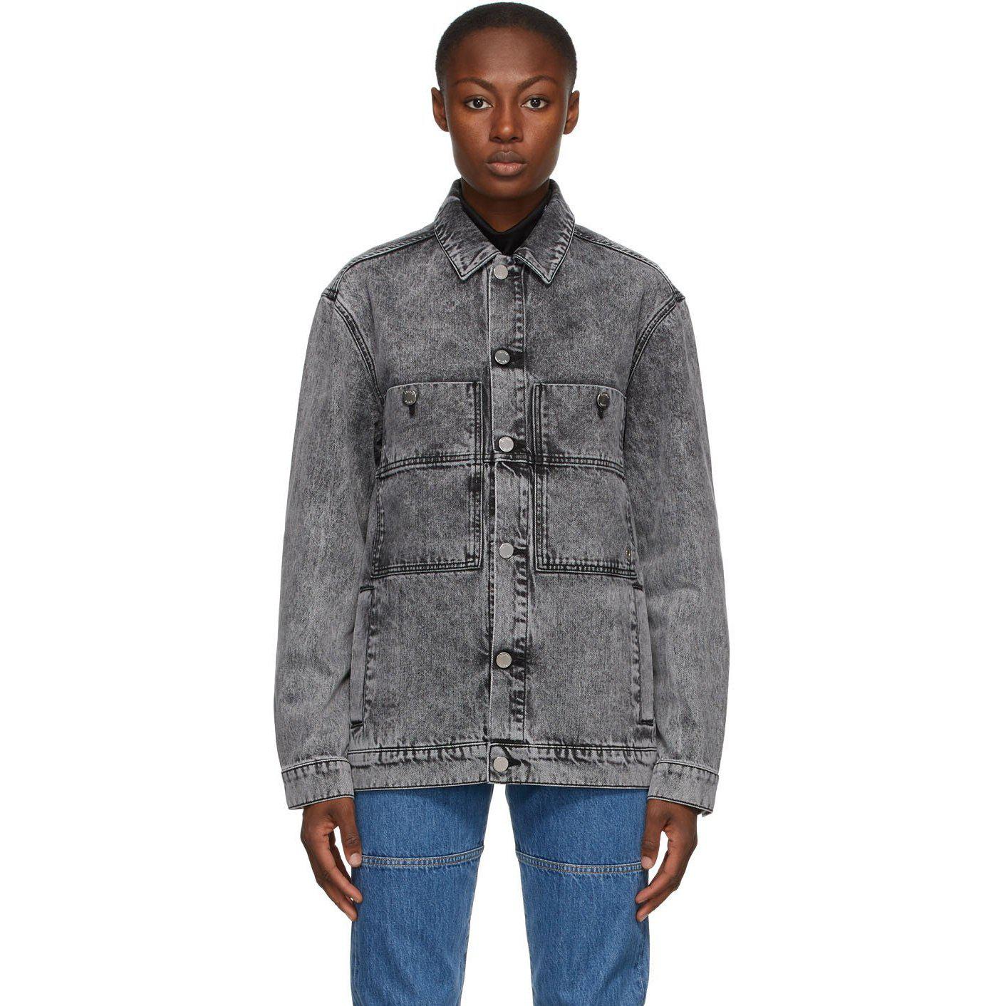 Long sleeve non-stretch denim jacket in black. Fading throughout. Spread collar. Button closure at front. Patch pocket at chest. Welt pockets at waist. Single-button barrel cuffs. Adjustable buttoned tabs at back hem. Unlined. Silver-tone hardware. Supplier color: Washed black 100% cotton. Brand: Études