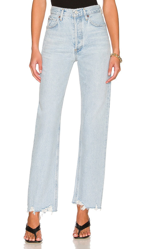 AGOLDE 90's Pinch Waist in Blue. - size 31 (also in 32, 33, 34) AGOLDE 90's Pinch Waist in Blue. - size 31 (also in 32, 33, 34) 100% organic cotton. Made in Turkey. Machine wash. Button fly. 5-pocket styling. Destroyed detail at cuffs. Light whiskering and fading. 15.5 at the knee narrows to 13 at the leg opening. AGOL-WJ391. A154E-1141. Based in downtown Los Angeles, AGOLDE is a premium denim label dedicated to highlighting youth culture throughout the decades. Instead of simply replicating your favorite styles from the past, they set out to recreate them with a contemporary approach in mind. The styles may emit an irreverent attitude, but AGOLDE is serious when it comes to quality. They use only the most innovative fabrics sourced from around the world and facilitate all product development to create denim of the highest caliber. Shop the latest in fashion from AGOLDE