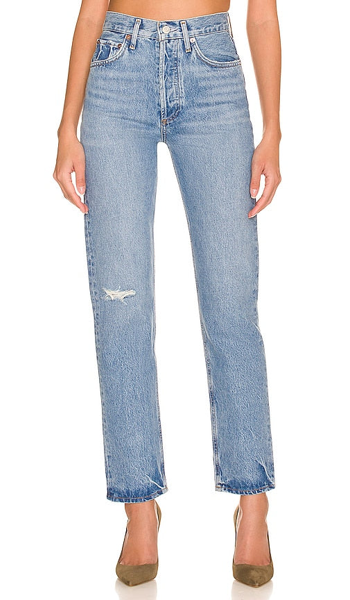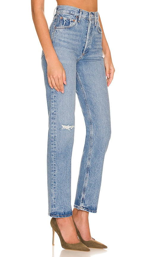 AGOLDE 90's Pinch Waist in Blue. - size 32 (also in 33, 34) AGOLDE 90's Pinch Waist in Blue. - size 32 (also in 33, 34) 100% cotton. Made in Turkey. Machine wash. Button fly. 5-pocket design. Intentionally distressed areas. Light whiskering and faded detail. 14 at the knee narrows to 12 at the leg opening. AGOL-WJ401. A154-1371. Based in downtown Los Angeles, AGOLDE is a premium denim label dedicated to highlighting youth culture throughout the decades. Instead of simply replicating your favorite styles from the past, they set out to recreate them with a contemporary approach in mind. The styles may emit an irreverent attitude, but AGOLDE is serious when it comes to quality. They use only the most innovative fabrics sourced from around the world and facilitate all product development to create denim of the highest caliber. Shop the latest in fashion from AGOLDE