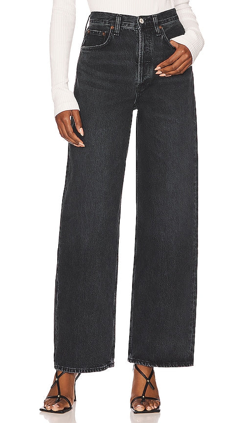 AGOLDE Low Rise Baggy in Black. - size 28 (also in 31, 32, 33) AGOLDE Low Rise Baggy in Black. - size 28 (also in 31, 32, 33) 100% organic cotton. Made in Turkey. Machine wash. Button fly. 5-pocket styling. Light whiskering and faded detail. 20 at the knee narrows to 18 at the leg opening. AGOL-WJ424. A9079-1346. Based in downtown Los Angeles, AGOLDE is a premium denim label dedicated to highlighting youth culture throughout the decades. Instead of simply replicating your favorite styles from the past, they set out to recreate them with a contemporary approach in mind. The styles may emit an irreverent attitude, but AGOLDE is serious when it comes to quality. They use only the most innovative fabrics sourced from around the world and facilitate all product development to create denim of the highest caliber. Shop the latest in fashion from AGOLDE