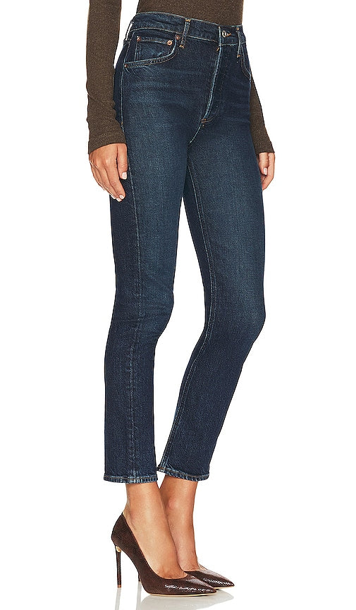 AGOLDE Riley Long in Blue. - size 23 (also in 24, 25, 26, 27, 28, 30, 32, 34) AGOLDE Riley Long in Blue. - size 23 (also in 24, 25, 26, 27, 28, 30, 32, 34) 50% organic cotton 40% viscose 1% elastane. Made in Turkey. Machine wash. Button fly. 5-pocket styling. Subtle stretch fit denim. 14 at the knee narrows to 12 at the leg opening. AGOL-WJ438. A9090B-1255. Based in downtown Los Angeles, AGOLDE is a premium denim label dedicated to highlighting youth culture throughout the decades. Instead of simply replicating your favorite styles from the past, they set out to recreate them with a contemporary approach in mind. The styles may emit an irreverent attitude, but AGOLDE is serious when it comes to quality. They use only the most innovative fabrics sourced from around the world and facilitate all product development to create denim of the highest caliber. Shop the latest in fashion from AGOLDE