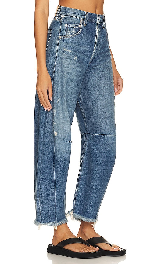 Citizens of Humanity Horseshoe Jean in Blue. - size 23 (also in 24, 25, 26, 27, 28, 29) Citizens of Humanity Horseshoe Jean in Blue. - size 23 (also in 24, 25, 26, 27, 28, 29) 100% cotton. Made in USA. Machine wash. Button fly. Light whiskering and intentionally destroyed areas. Frayed raw-cut hem. Structured denim fabric. 24 at the knee narrows to 18 at the leg opening. CITI-WJ1770. 1972B-769. Established in 2003, Citizens of Humanity is renowned in the fashion industry for its pioneering approach to premium denim. With an uncompromising focus on fit, fabric and wash. Citizens of Humanity jeans are the ultimate luxury denim. Shop the latest in fashion from Citizens of Humanity
