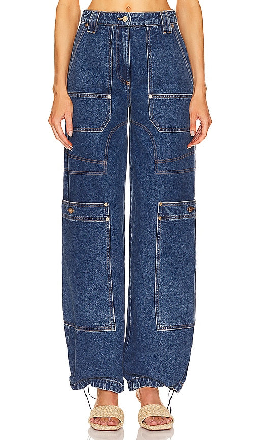 Cult Gaia Wynn Wide Leg in Blue. - size 23 (also in 24, 25, 27, 28) Cult Gaia Wynn Wide Leg in Blue. - size 23 (also in 24, 25, 27, 28) 100% cotton. Made in USA. Machine wash. Zip fly with button closure. 4-pocket design. Cargo pockets. Midweight denim fabric. 22 at the knee narrows to 18 at the leg opening. CULG-WJ4. PTWLDN. Founded in 2012 by designer Jasmin Larian, Cult Gaia is a brand that takes art just as serious as fashion: the timeless collection's pieces are crafted as stunning heirloom items made to live in one's wardrobe forever. As an artistic label that designs for the moving eye, Cult Gaia aims to create an effortless visual feast through its intricately designed accessories, such as handbags, hats and jewelry. Shop the latest in fashion from Cult Gaia