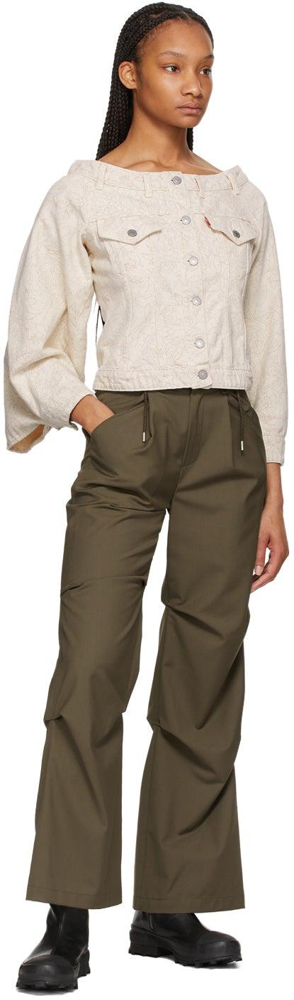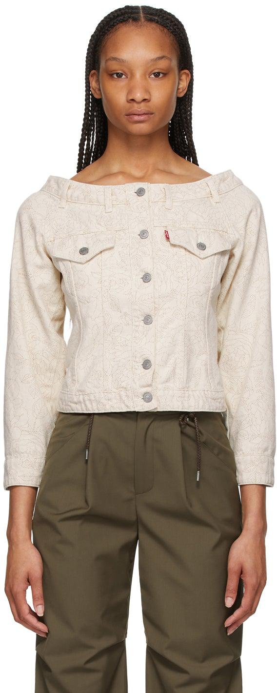 Long sleeve upcycled non-stretch cotton and hemp-blend off-the-shoulder denim jacket in off-white. Logo pattern and floral pattern printed in brown throughout. Belt loops at boat neck collar. Button closure at front. Flap pockets at chest. Buttoned tab at flared cuffs. Adjustable buttoned tabs at back hem. Unlined. Logo-engraved antiqued silver-tone hardware. This garment is reconstructed from vintage denim. Please note that coloration and finishings may vary. Part of the Ganni x Levi's collaboration. Supplier color: Nature 77% cotton, 23% hemp. Brand: GANNI