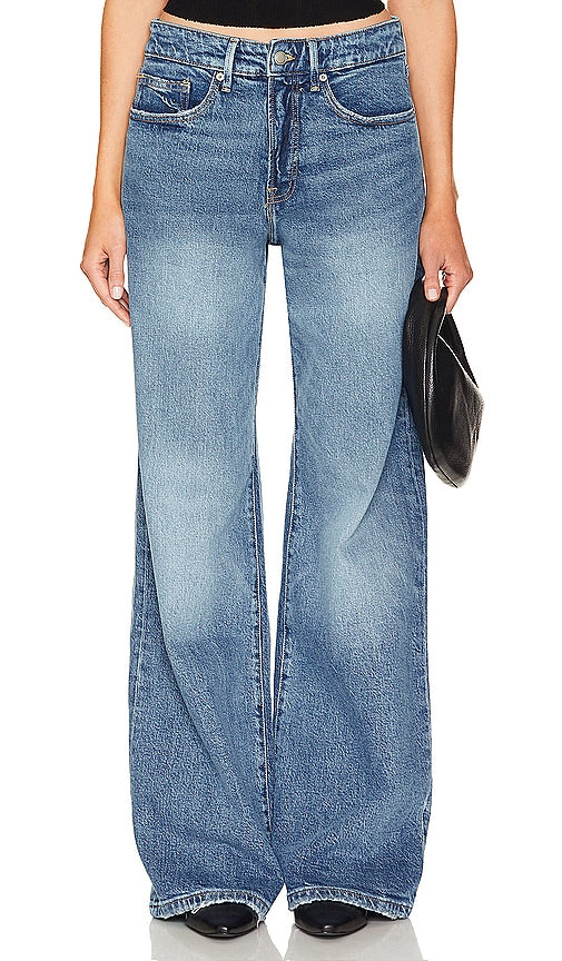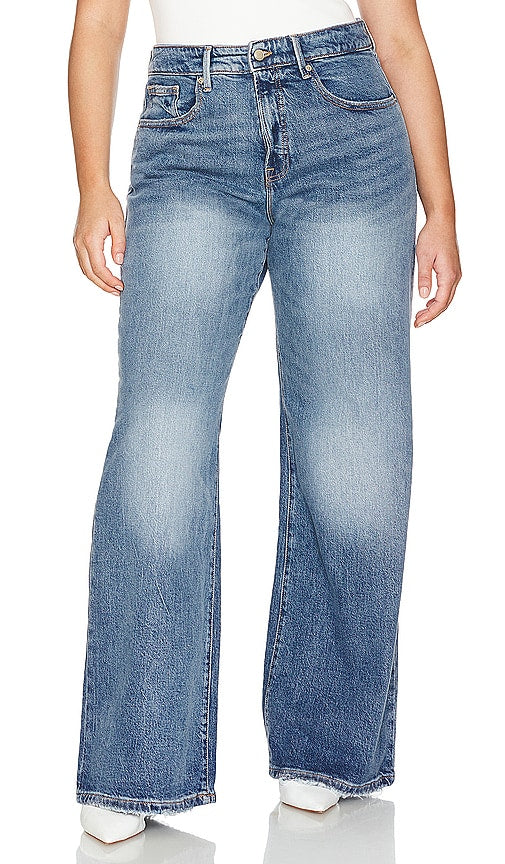 Good American Good Ease in Blue. - size 0 (also in 10, 18, 2, 20, 22, 24, 4, 6, 8) Good American Good Ease in Blue. - size 0 (also in 10, 18, 2, 20, 22, 24, 4, 6, 8) 49% cotton 30% tencel 20% recycled cotton 1% elastane. Made in Pakistan. Machine wash. Zip fly with button closure. 5-pocket design. Heavy whiskering and fading detail. 22 at the knee breaks to 24 at the leg opening. GAME-WJ131. GRWL384. Good American is made by women, for women. All bodies. All Sizes. No compromises. In 2016, entrepreneurs Emma Grede and Khloe Kardashian launched their now-iconic denim label with the intention of redefining contemporary fashion through innovative and inclusive designs. With curves as their cause, Good American offers eco-friendly quality and style in every size, empowering women to celebrate their bodies with sexy confidence. Shop the latest in fashion from Good American