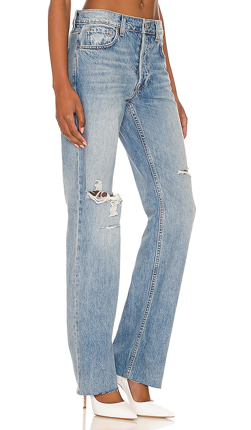 GRLFRND Courtney Low Rise Loose Boot in Blue. - size 30 (also in 31, 32) GRLFRND Courtney Low Rise Loose Boot in Blue. - size 30 (also in 31, 32) 100% cotton. Made in USA. Machine wash. Button fly. 5-pocket design. Intentionally distressed areas. Light whiskering and fading detail. 16.5 at the knee breaks to 18 at the leg opening. GRLR-WJ534. GF45629861787. Introducing your new GRLFRND. Based in LA, GRLFRND Denim crafts pieces focused on fit and individuality, blending unique details with vintage silhouettes. The premium denim label reimagines everyday staples with a contemporary vision, drawing inspiration from enduring styles and comfort. Bold, versatile, and unexpected - a fresh approach to classic denim. Explore the collection featuring remarkable ready-to-wear pieces designed with premium qualities and directional silhouettes to perfectly complement the denim Shop the latest in fashion from GRLFRND