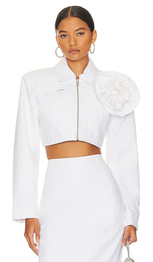 LAMARQUE Aneesa Denim Jacket With Removable Floral Applique in White. - size S (also in XS, XXS) LAMARQUE Aneesa Denim Jacket With Removable Floral Applique in White. - size S (also in XS, XXS) 100% cotton. Made in India. Machine wash. Front zipper closure. Padded shoulders. Detachable exaggerated rosette. Buttoned cuffs. Item not sold as a set. LARX-WO221. ANEESA DENIM. LAMARQUE specializes in luxurious leather garments, contemporary apparel & elevated outerwear. Designed in Montreal by Creative Director Ifigenia Papadimitriou, the brand is committed to achieving the essence of urban elegance with each design, from polished silk blouses to classically cool leather bikers and everything in between. Season after season, the collection remains perfectly timeless, yet with an iconic, fashion-forward edginess. Shop the latest in fashion from LAMARQUE