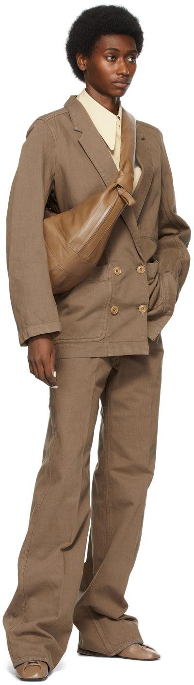 Long sleeve garment-dyed non-stretch denim jacket in brown. Notched lapel collar. Double-breasted button closure at front. Patch pockets at waist. Patch pocket at interior. Unlined. Available exclusively at SSENSE. Supplier color: Tobacco 100% cotton. Brand: Lemaire