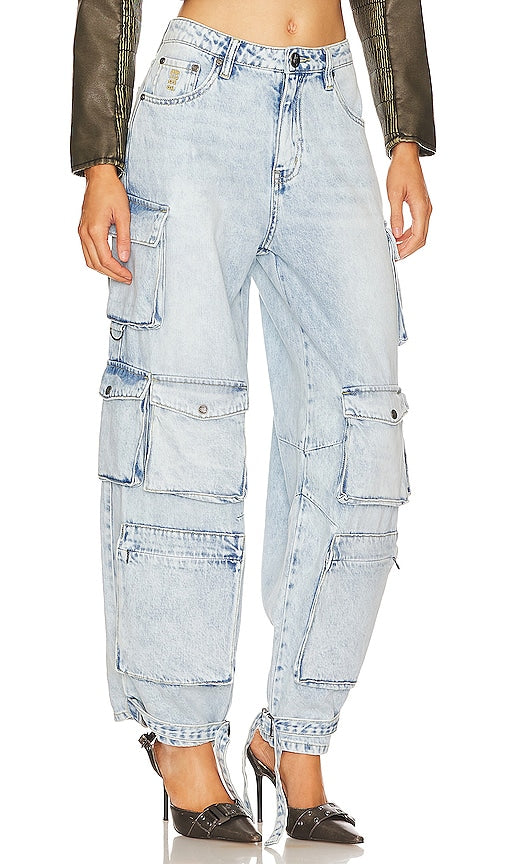One Teaspoon High Waist Epic Cargo in Blue. - size 23 (also in 24, 25, 26, 27) One Teaspoon High Waist Epic Cargo in Blue. - size 23 (also in 24, 25, 26, 27) Cotton blend fabric. Imported. Machine wash recommended. Zip fly with button closure. 13-pocket styling includes eight cargo pockets. Denim straps at hem with buckle. Rigid denim fabric with signature embroidered logo. 26 at the knee narrows to 20 at the leg opening. ONET-WJ221. 26245. Australian designer Jamie Blakey sewed her first collection in her very own bedroom. Now, nearly a decade later, her Sydney-based line has found an international fan base. Known for clothing that is casual and beachy, One Teaspoon offers pieces that are effortless, cool, and still have that handmade feel. Shop the latest in fashion from One Teaspoon