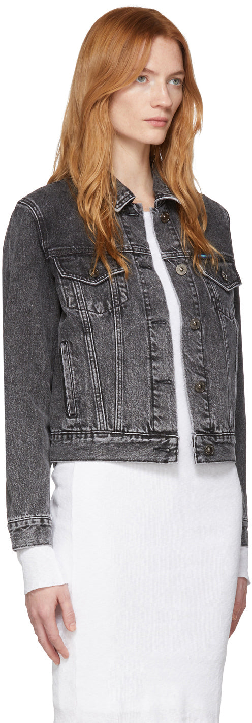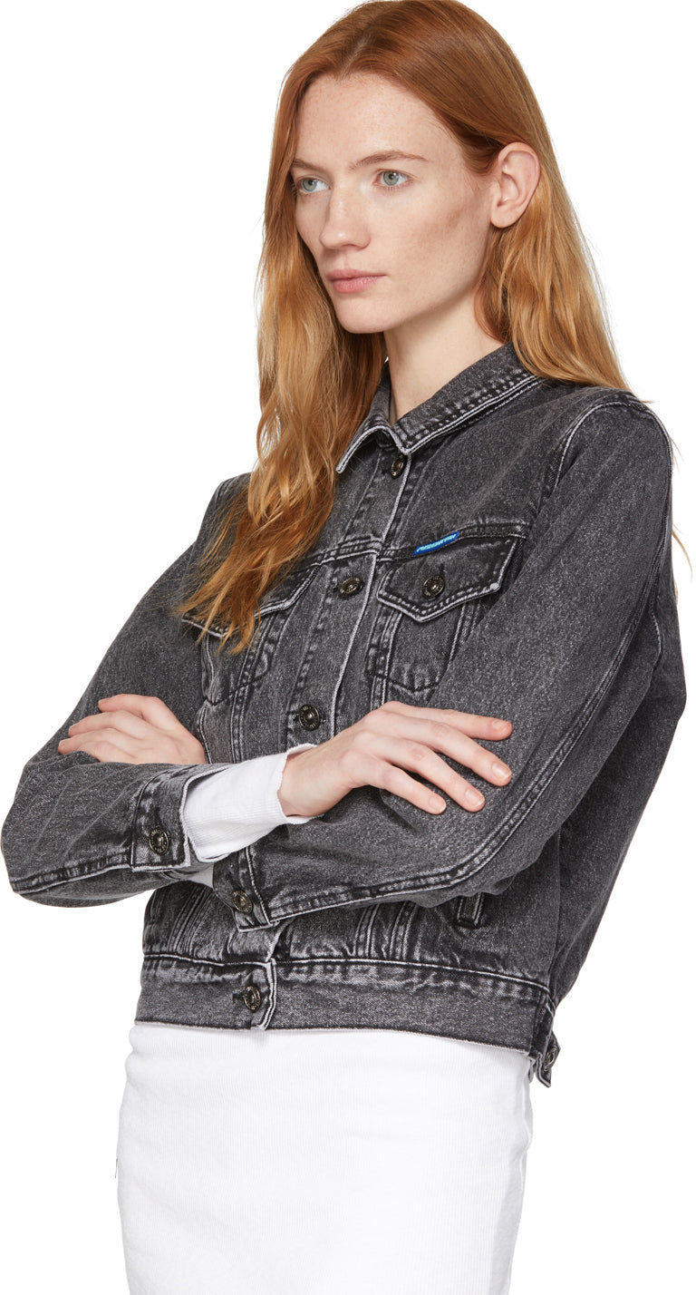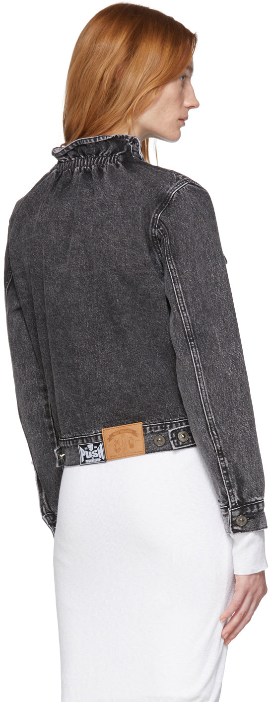 Long sleeve panelled non-stretch denim jacket in grey. Fading and bleached effect throughout. Spread collar. Partially elasticized at back collar. Button closure at front. Rubberized logo appliqué in tones of blue and flap pockets at chest. Welt pockets at waist. Single-button barrel cuffs. Adjustable buttoned tabs and leather logo patches in tan and black at back waistband. Unlined. Logo-engraved gunmetal-tone hardware. Supplier color: Grey 100% cotton. Brand: Pushbutton
