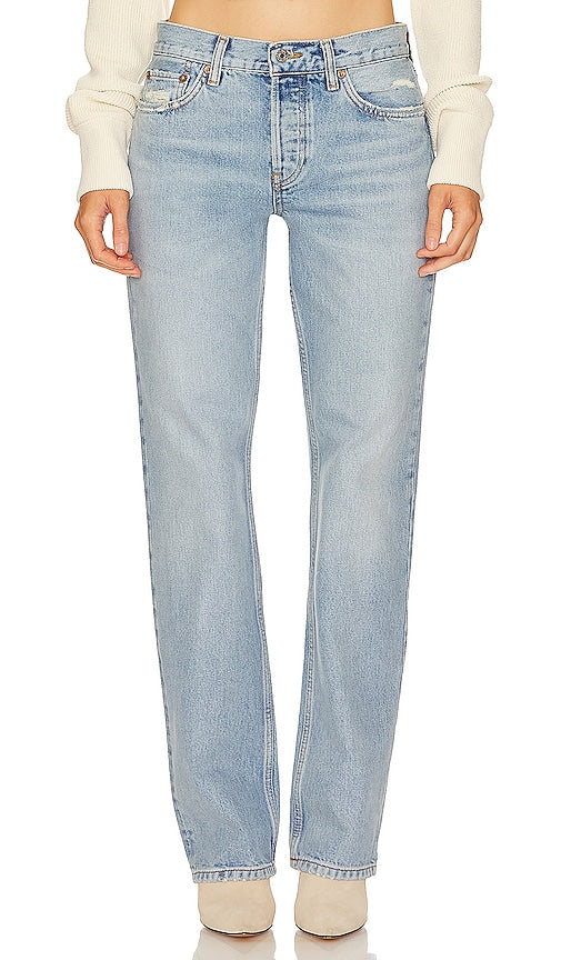 RE/DONE Originals Easy Straight in Denim-Light. - size 26 (also in 27, 28, 29, 30, 31) RE/DONE Originals Easy Straight in Denim-Light. - size 26 (also in 27, 28, 29, 30, 31) Self: 100% organic cotton Lining: 65% polyester 35% cotton. Made in Turkey. Machine wash. Button fly. 5-pocket styling. Distressed pocket detail. Rigid denim fabric. 16 at the knee narrows to 14 at the leg opening. REDR-WJ301. 141-03WESYSTR. Iconic. Responsible. Individual. Launched in Los Angeles in 2014 by industry veterans Sean Barron and Jamie Mazur, RE/DONE started with a simple idea of taking the old and making it new again. This is present in everything RE/DONE does from upcycling vintage Levi's to reimagining vintage Hanes tees with recycled fabric. Today, they continue to honor their exclusive heritage partnerships, while expanding their offering to also include recycled knits, upcycled ready to wear, and sneakers handmade in Italy by expert artisans. As of 2020, RE/DONE has upcycled nearly 100,000 pairs of vintage Levis. Shop the latest in fashion from RE/DONE