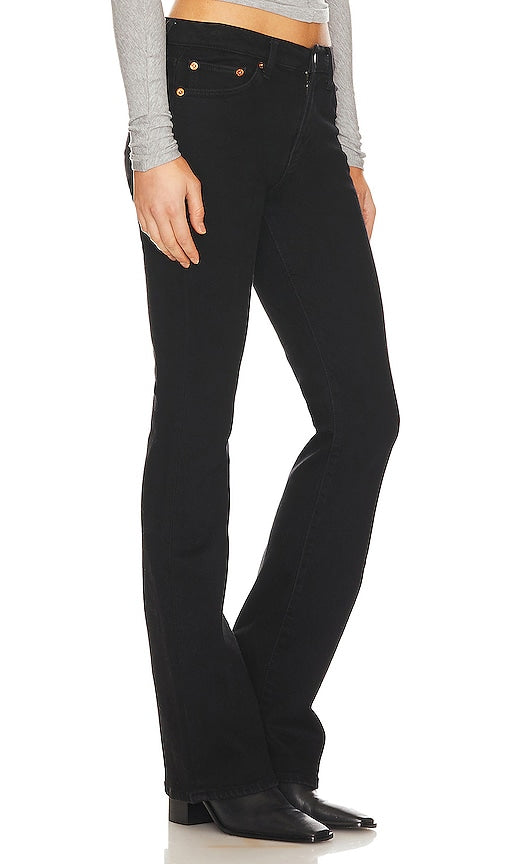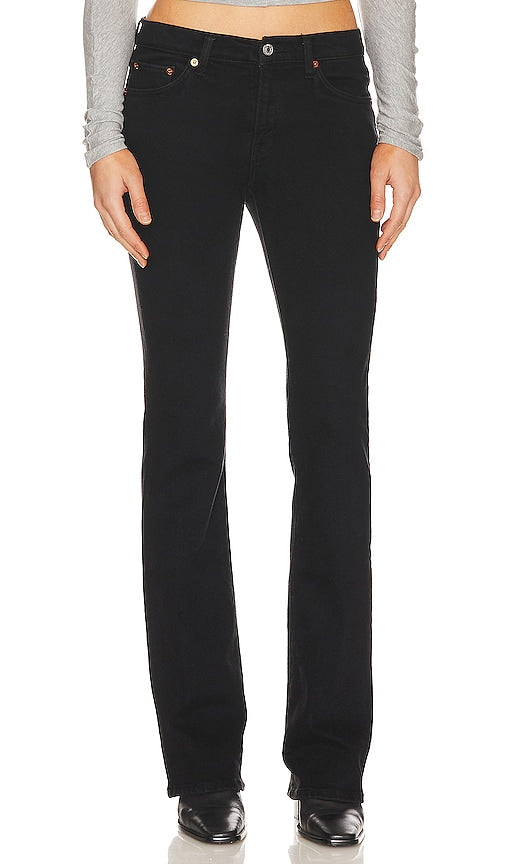 RE/DONE Originals Midrise Baby Boot in Black. - size 27 (also in 28, 29, 30, 31) RE/DONE Originals Midrise Baby Boot in Black. - size 27 (also in 28, 29, 30, 31) Self: 97% organic cotton 3% recycled elastane Lining: 65% polyester 35% cotton. Made in Turkey. Machine wash. Zip fly with button closure. 5-pocket styling. 14 at the knee breaks to 18 at the leg opening. REDR-WJ298. 144-03WBBYBOT. Iconic. Responsible. Individual. Launched in Los Angeles in 2014 by industry veterans Sean Barron and Jamie Mazur, RE/DONE started with a simple idea of taking the old and making it new again. This is present in everything RE/DONE does from upcycling vintage Levi's to reimagining vintage Hanes tees with recycled fabric. Today, they continue to honor their exclusive heritage partnerships, while expanding their offering to also include recycled knits, upcycled ready to wear, and sneakers handmade in Italy by expert artisans. As of 2020, RE/DONE has upcycled nearly 100,000 pairs of vintage Levis. Shop the latest in fashion from RE/DONE