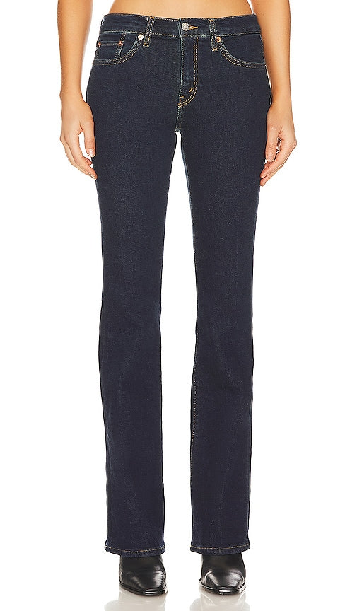 RE/DONE Originals Midrise Baby Boot in Blue. - size 23 (also in 25, 26, 27, 28, 29, 30, 31) RE/DONE Originals Midrise Baby Boot in Blue. - size 23 (also in 25, 26, 27, 28, 29, 30, 31) Self: 96% cotton 3% polyester 1% elastane Lining: 65% polyester 35% cotton. Made in Turkey. Machine wash. Zip fly with button closure. 5-pocket styling. 14 at the knee breaks to 18 at the leg opening. REDR-WJ299. 190-03WBBYBOT. Iconic. Responsible. Individual. Launched in Los Angeles in 2014 by industry veterans Sean Barron and Jamie Mazur, RE/DONE started with a simple idea of taking the old and making it new again. This is present in everything RE/DONE does from upcycling vintage Levi's to reimagining vintage Hanes tees with recycled fabric. Today, they continue to honor their exclusive heritage partnerships, while expanding their offering to also include recycled knits, upcycled ready to wear, and sneakers handmade in Italy by expert artisans. As of 2020, RE/DONE has upcycled nearly 100,000 pairs of vintage Levis. Shop the latest in fashion from RE/DONE