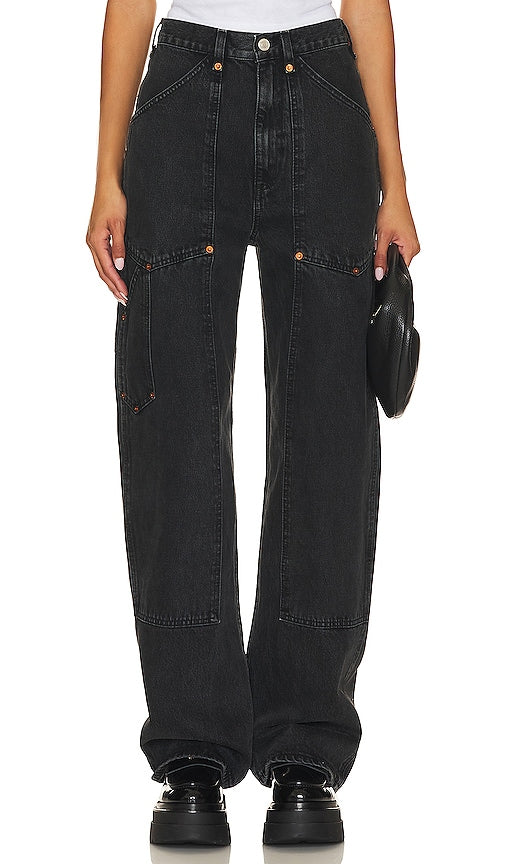 RE/DONE Originals Super High Workwear in Black. - size 31 (also in 32) RE/DONE Originals Super High Workwear in Black. - size 31 (also in 32) Self: 100% cotton Lining: 65% polyester 35% cotton. Made in Turkey. Machine wash. Zip fly with button closure. 6-pocket styling includes two cargo pockets. Rigid denim fabric. 22 at the knee narrows to 19 at the leg opening. REDR-WJ290. 198-03WSPHWRK. Iconic. Responsible. Individual. Launched in Los Angeles in 2014 by industry veterans Sean Barron and Jamie Mazur, RE/DONE started with a simple idea of taking the old and making it new again. This is present in everything RE/DONE does from upcycling vintage Levi's to reimagining vintage Hanes tees with recycled fabric. Today, they continue to honor their exclusive heritage partnerships, while expanding their offering to also include recycled knits, upcycled ready to wear, and sneakers handmade in Italy by expert artisans. As of 2020, RE/DONE has upcycled nearly 100,000 pairs of vintage Levis. Shop the latest in fashion from RE/DONE