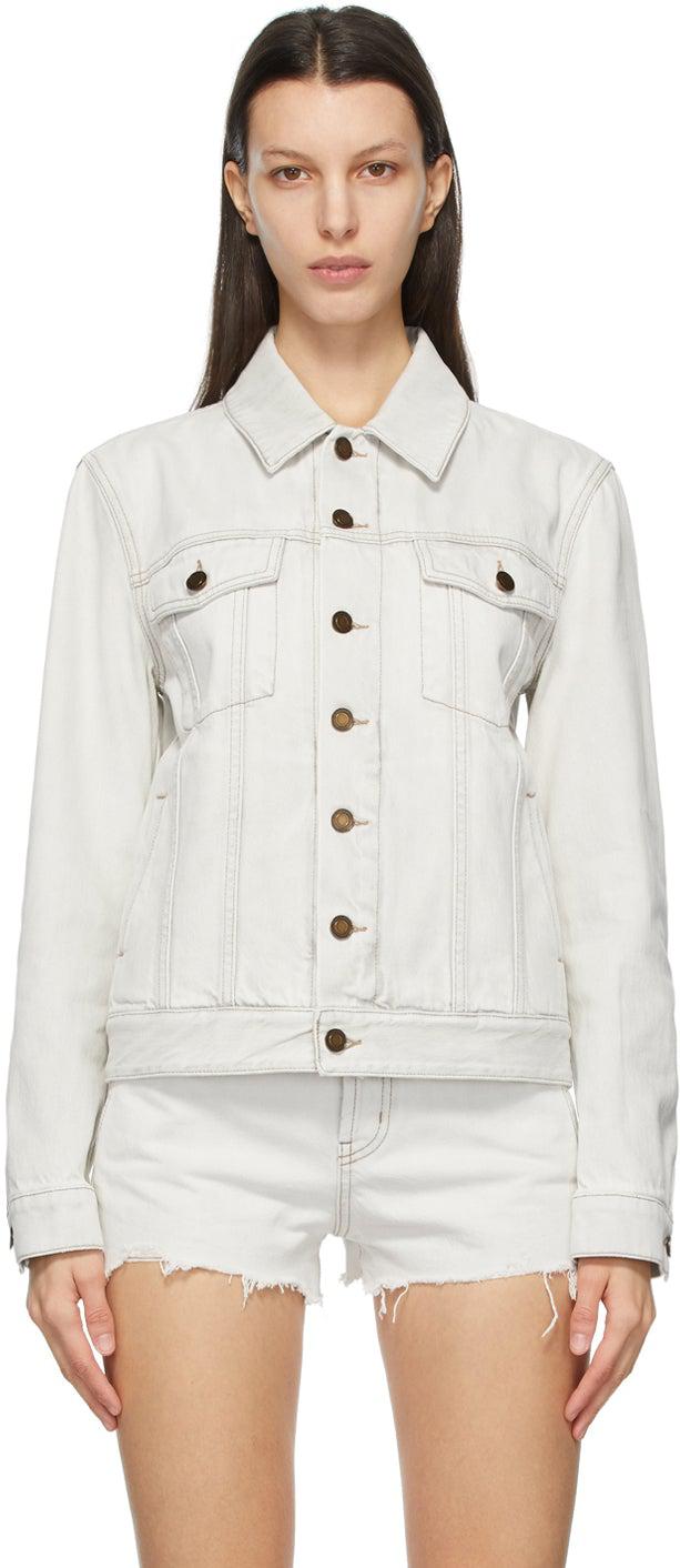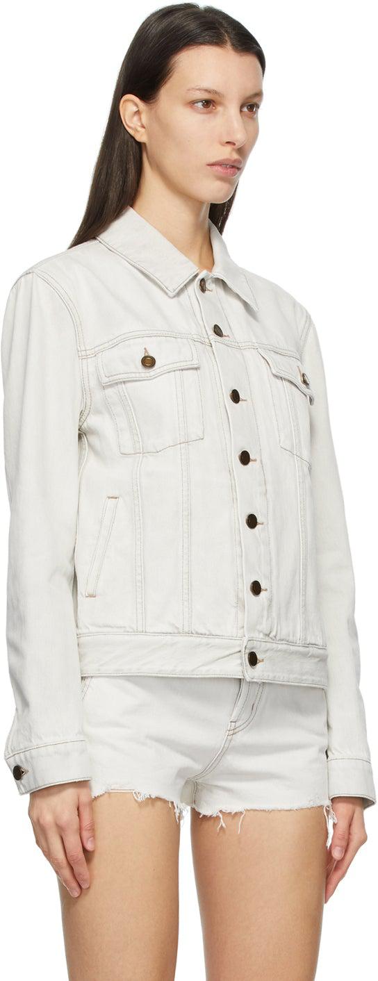 Long sleeve non-stretch denim jacket in grey. Fading and distressing throughout. Spread collar. Button closure at front. Buttoned flap pockets at chest. Welt pockets at waist. Single-button barrel cuffs. Adjustable buttoned tabs at back hem. Welt pocket at interior. Fully lined. Logo-engraved copper-tone hardware. Contrast stitching in tan. Supplier color: Grey off white 100% cotton. Brand: Saint Laurent