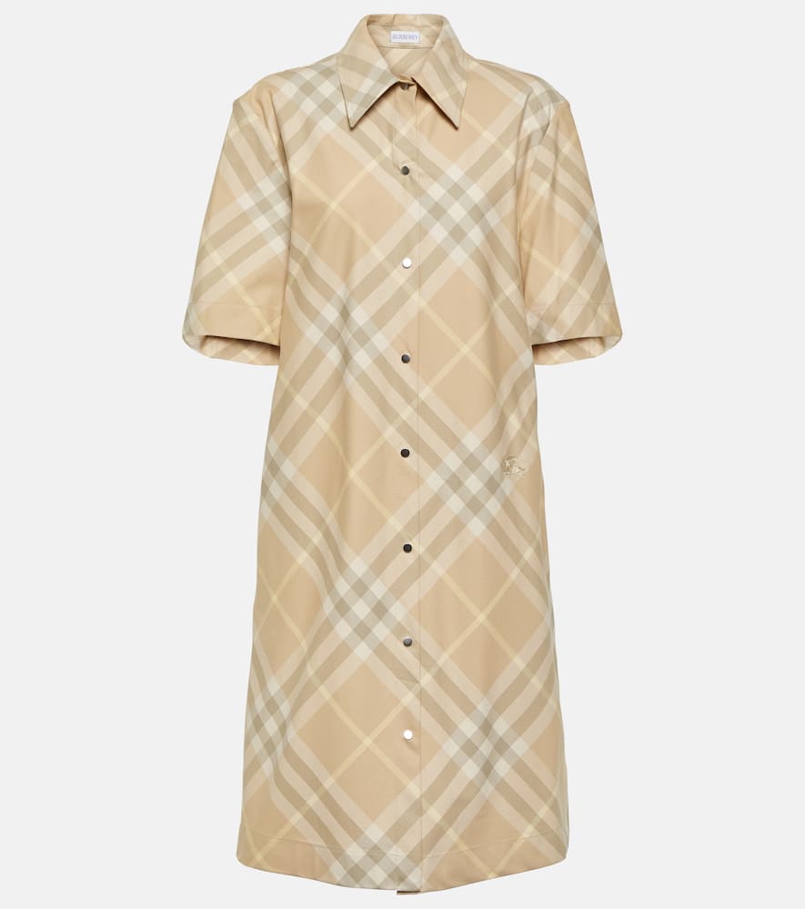 Material: 100% cotton. Care instructions: dry clean. Made in Romania. Designer color name: Flax Ip Check. Closure: snap-buttoned front. Pockets: side slit pockets. Attached belt. Shop the latest Burberry Mini Dresses for women.