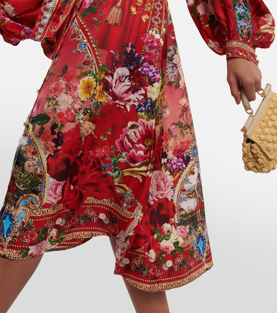 Pockets: side slit pockets. Material: 100% silk. Closure: buttoned front. Designer color name: Rites Of Roses. Self-tie belt. Care instructions: dry clean. Made in India. Shop the latest Camilla Midi Dresses for women.